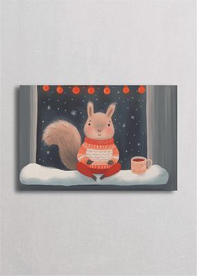 Encantadora ardilla beige con cola esponjosa sentada en el alféizar de una ventana nevada, contemplando la noche estrellada mientras disfruta una taza de chocolate caliente. Viste un suéter naranja y crema de patrón nórdico bajo una guirnalda de linternas naranjas festivas. Esta ilustración horizontal captura la magia de observar la nieve caer desde la calidez del hogar, transmitiendo hygge, contemplación tranquila y los placeres simples del invierno con una atmósfera acogedora, nostálgica y profundamente reconfortante que invita a la reflexión pausada.
