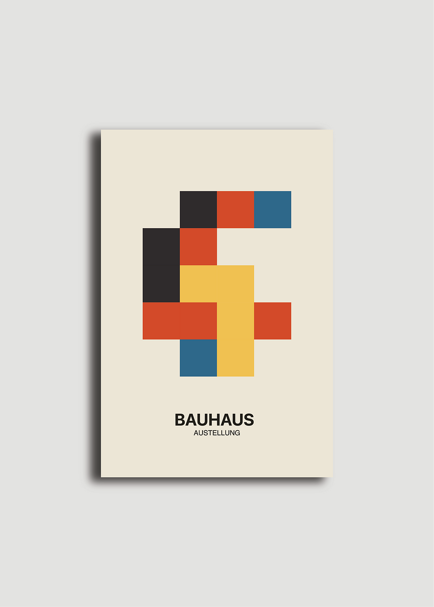 Presenta una composición de cuadrados que recuerda a las figuras de Tetris, fusionando formas geométricas y colores primarios vibrantes. Inspirada en el estilo Bauhaus, cada obra es una representación visual de simplicidad, funcionalidad y armonía