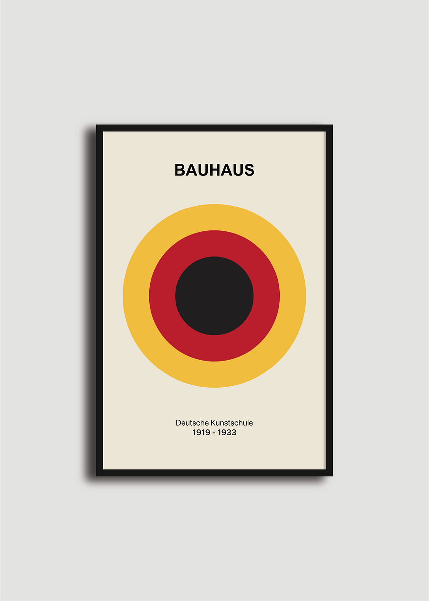 Es una representación artística que combina la esencia del estilo Bauhaus con los colores icónicos de Alemania. Tres círculos, dispuestos del más pequeño al más grande, fusionan armoniosamente los tonos negro, rojo y amarillo, creando una obra que refleja la simplicidad elegante y la identidad cultural.