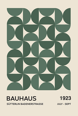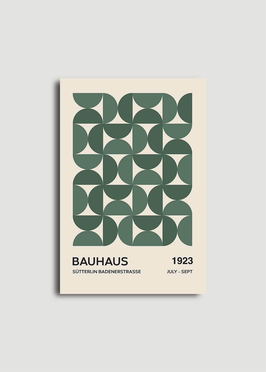 Este póster artístico presenta un elegante diseño geométrico inspirado en la estética Bauhaus de 1923. Con formas semicirculares repetidas en un patrón armónico y un tono verde profundo sobre fondo crema, esta obra aporta equilibrio, modernidad y un estilo minimalista a cualquier espacio. Ideal para amantes del diseño moderno, interiores contemporáneos y decoración con esencia retro–artística. Perfecto para enmarcar y dar un toque sofisticado a tu hogar, oficina o estudio creativo.