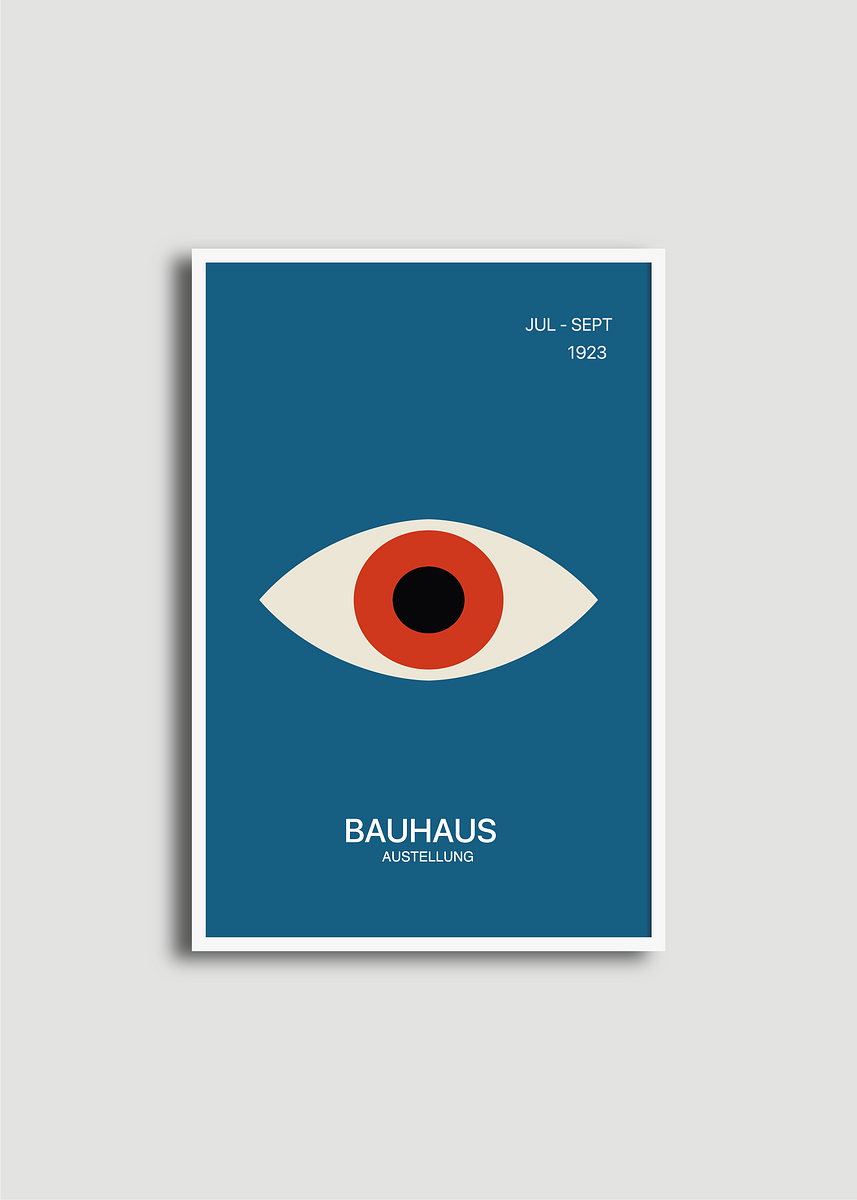 Es una obra que fusiona el simbolismo del ojo con la estética moderna del estilo Bauhaus. La pupila negra, enmarcada por un contorno rojo audaz, se destaca sobre un fondo azul profundo. Esta composición evoca una sensación de observación y enfoque, mientras abraza la simplicidad y la vibrante paleta de colores característica del movimiento Bauhaus.