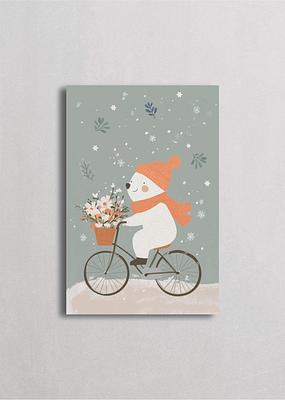 Encantador muñeco de nieve paseando en bicicleta con una canasta de flores bajo la nevada sobre fondo menta. El gorro y bufanda naranja añaden calidez a esta escena invernal llena de movimiento y alegría. Perfecto para quienes aman las ilustraciones whimsical que combinan la magia del invierno con toques vintage y románticos, ideal para entradas, salas o espacios creativos.
