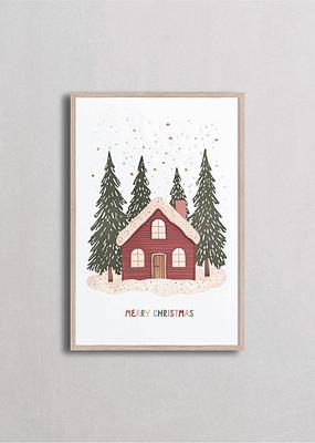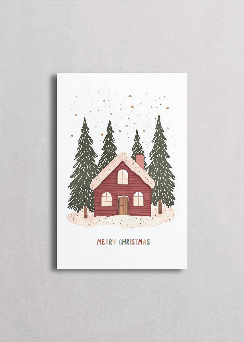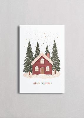 Cabaña roja entre majestuosos pinos nevados con el mensaje "Merry Christmas" brillando en la nieve. Esta postal vintage captura el espíritu cálido de la Navidad tradicional, invitándote a imaginar tardes junto al fuego y el aroma de galletas recién horneadas. Los tonos terrosos y las texturas artesanales aportan autenticidad y nostalgia a tu decoración festiva.
