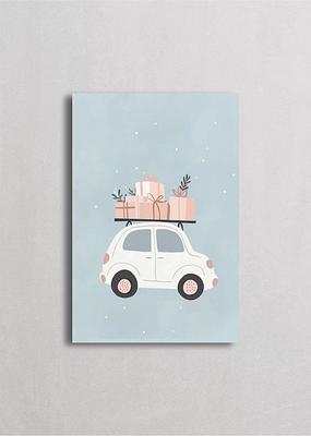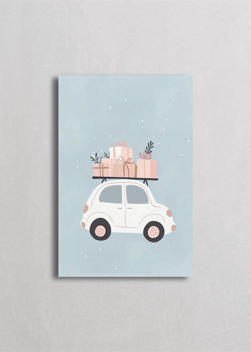 Adorable auto vintage blanco cargando regalos navideños envueltos en tonos rosa, beige y terracota, decorados con ramitas de pino. Fondo celeste con copos de nieve que crea una atmósfera festiva y dulce, perfecto para decoración infantil con estilo minimalista moderno.