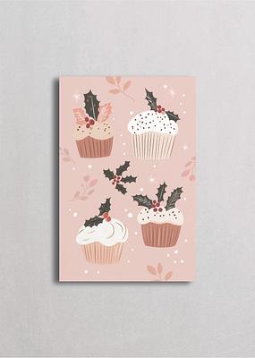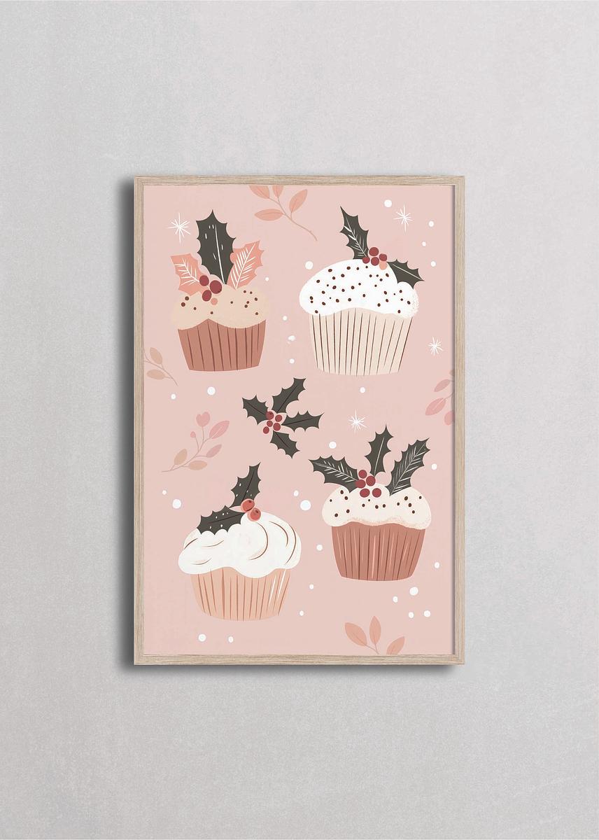 Cuatro cupcakes festivos decorados con betún blanco, hojas de acebo y bayas rojas en tonos rosa pastel. Ramitas decorativas y copos de nieve completan la escena dulce. Ilustración encantadora perfecta para cocinas, comedores o espacios infantiles durante la Navidad.