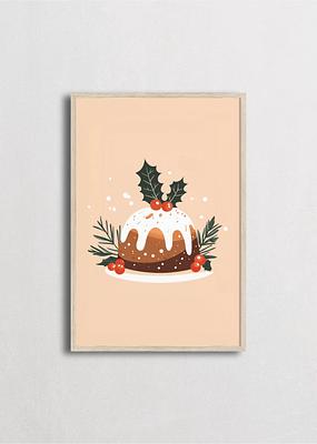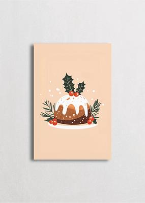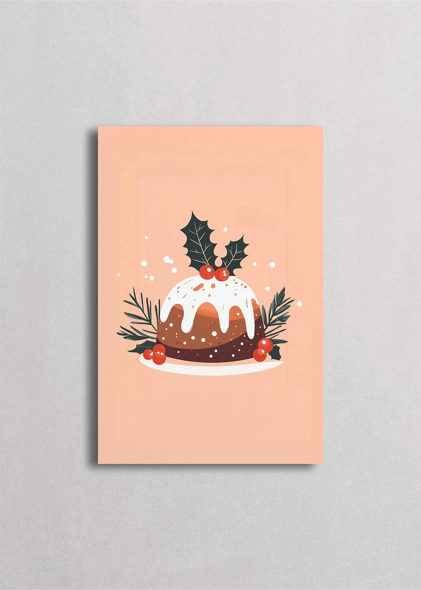 Delicioso pudding navideño decorado con glaseado blanco, hojas de acebo y bayas rojas sobre ramas de pino. Fondo beige con copos de nieve crean una atmósfera festiva y dulce. Ilustración perfecta para cocinas, comedores o espacios infantiles durante la temporada navideña.