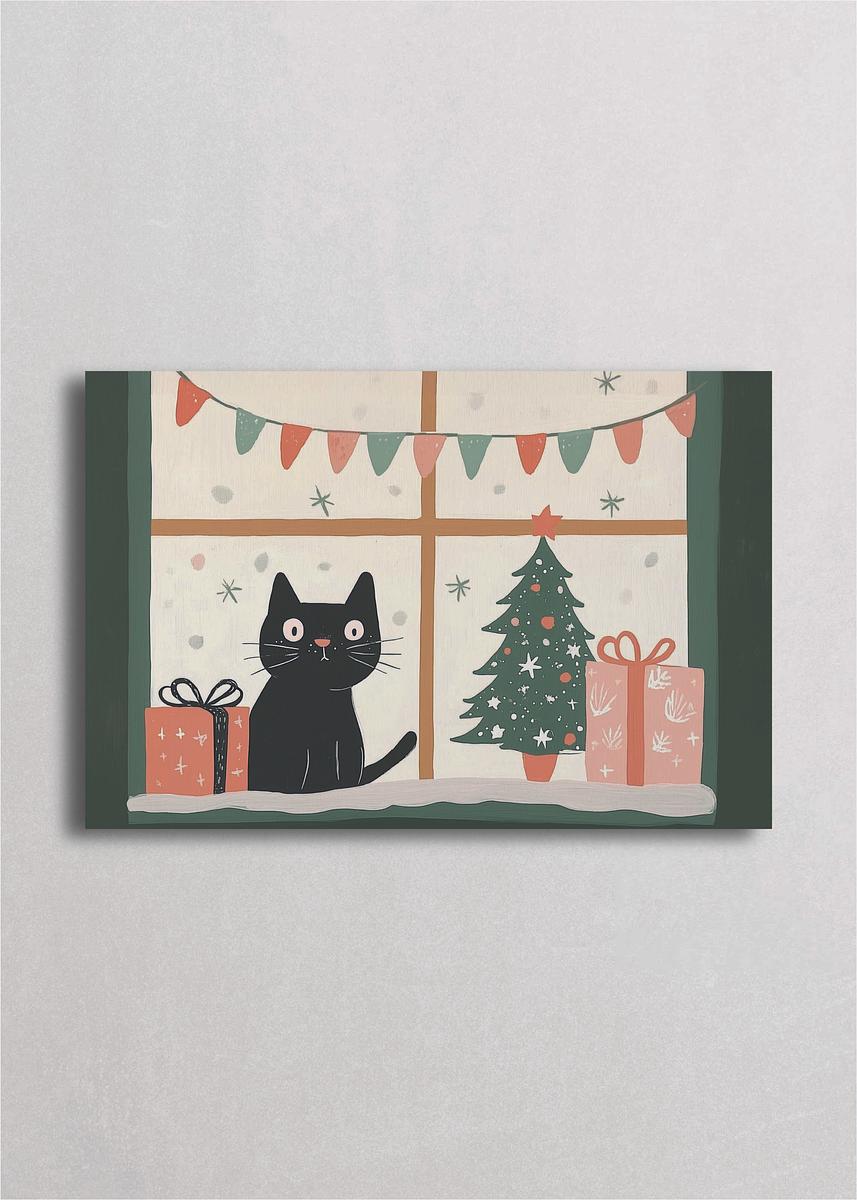 Adorable gato negro observando por la ventana junto a un árbol de Navidad decorado y regalos envueltos. Guirnalda festiva en tonos terracota y verde decora la escena. Diseño acogedor y tierno ideal para amantes de los gatos y la decoración navideña minimalista.