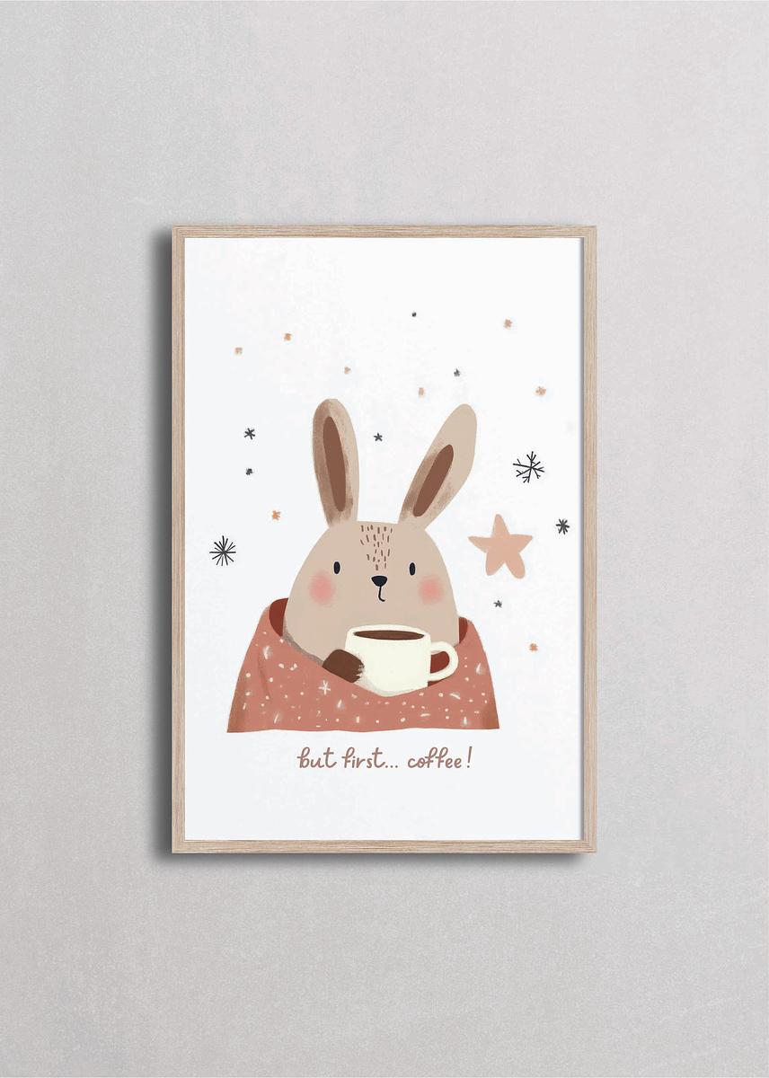 Adorable ilustración de un conejito acogedor sosteniendo una taza de café, perfecto para los amantes del café y las mañanas tranquilas. Con tonos cálidos tierra y detalles encantadores como estrellas y un suéter de puntos, este arte añade un toque de calidez y humor a cualquier cocina, oficina o rincón de lectura.