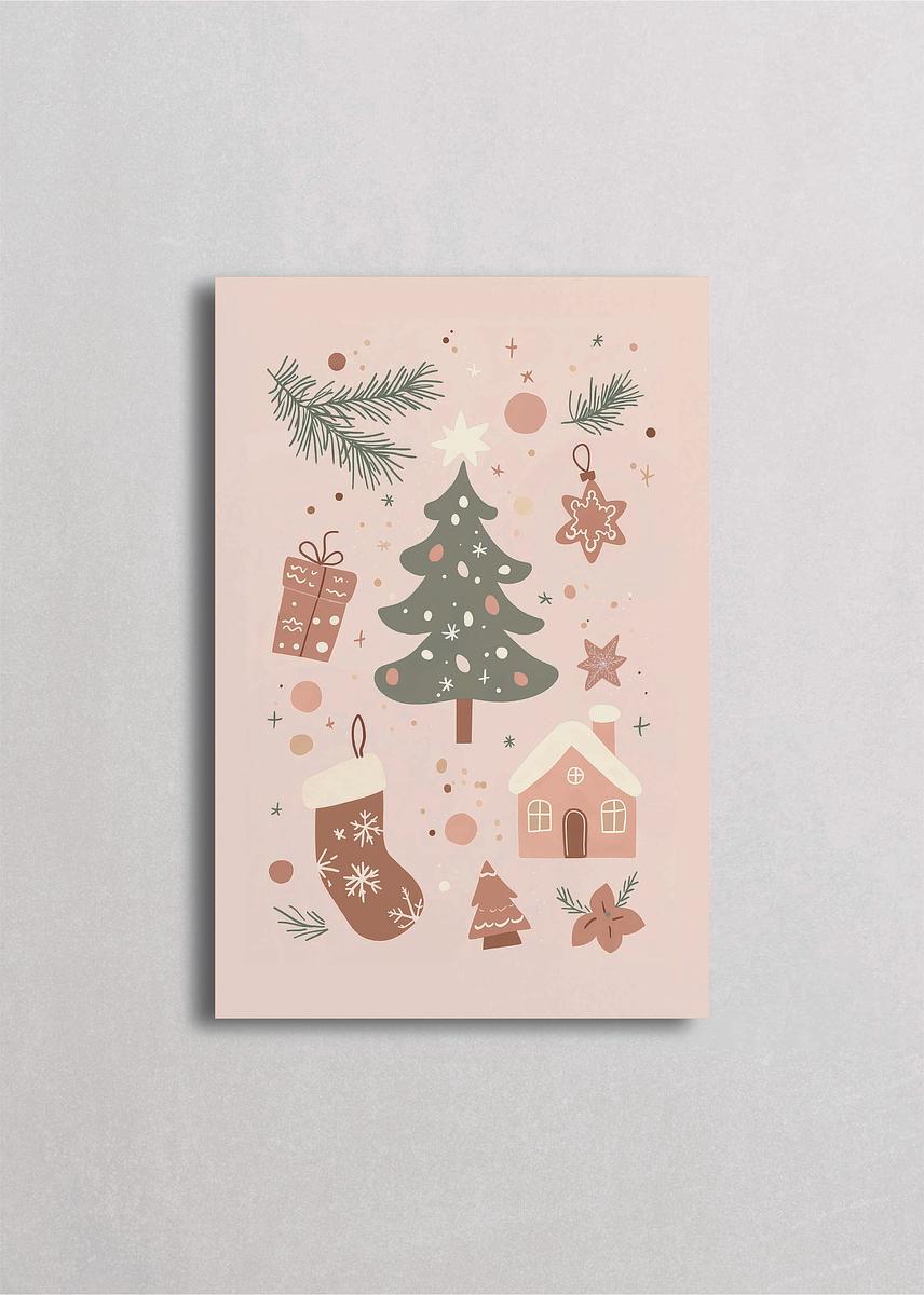 Póster navideño con árbol decorado, calcetín con copos de nieve, galleta de jengibre en forma de estrella y casita acogedora en tonos tierra, verde oliva y beige. Perfecto para decorar habitaciones infantiles con un estilo escandinavo moderno y cálido que captura la magia de la Navidad.