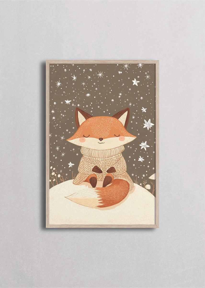 Adorable zorro acurrucado bajo un cielo estrellado de invierno, vistiendo un suéter tejido mientras descansa sobre una colina nevada. Esta ilustración captura la magia de las noches frías de invierno con su paleta de colores cálidos y detalles encantadores que transmiten paz y calidez hogareña.