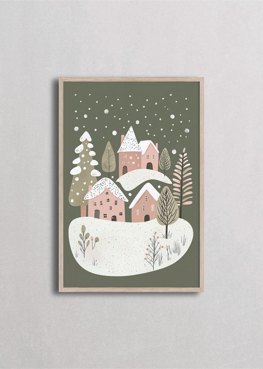 Pueblo invernal con casitas rosadas bajo la nieve, donde las luces cálidas iluminan las ventanas en medio de la tormenta. Esta obra evoca la calidez del hogar en las noches más frías, transportándote a un cuento de hadas escandinavo. Perfecta para añadir un toque de romanticismo invernal a cualquier espacio, recordándonos la belleza de estar en casa durante las festividades.