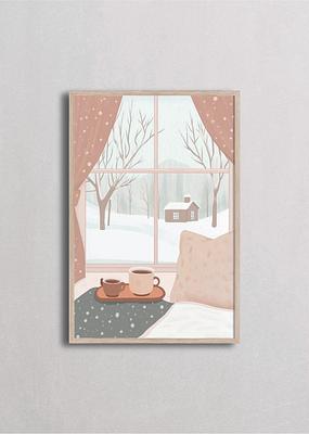 Vista acogedora desde una ventana nevada con dos tazas de chocolate caliente sobre una manta verde. Paisaje invernal con árboles desnudos y casita nevada al fondo. Tonos beige y neutros crean una atmósfera cálida perfecta para espacios de descanso y relajación.