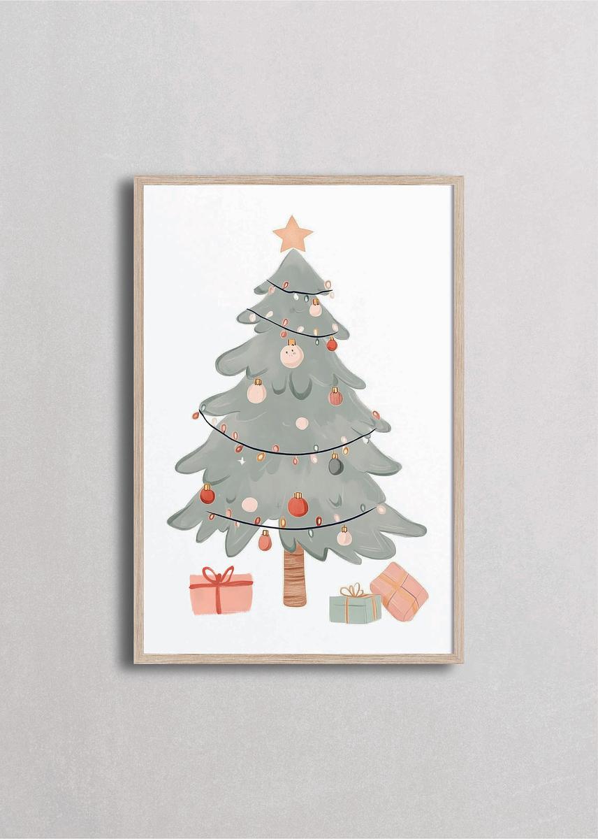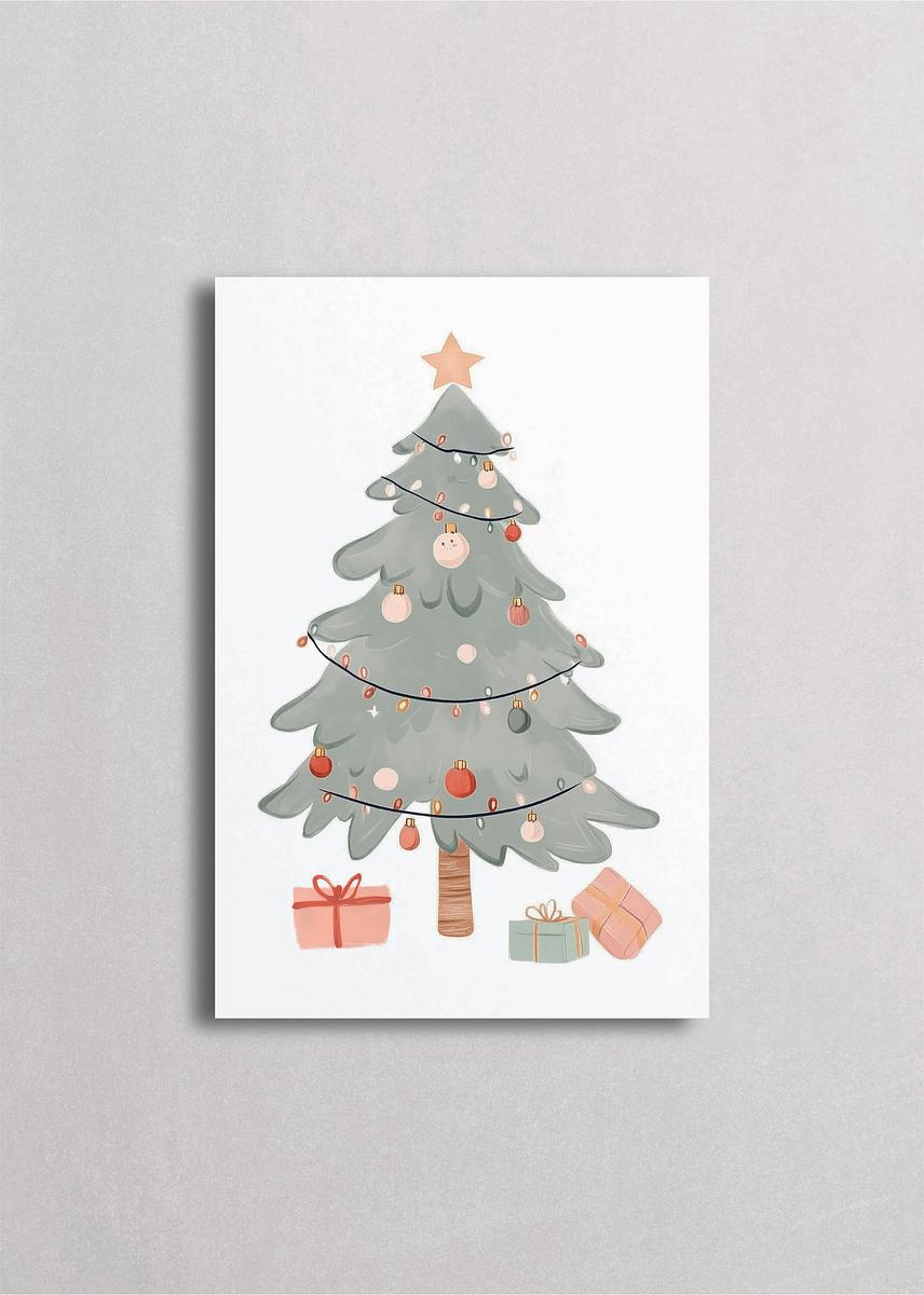 Árbol de Navidad estilo cottage adornado con luces multicolor, esferas festivas y regalos esperando bajo sus ramas. Esta ilustración vibrante celebra la tradición de decorar el árbol familiar con todo el amor y la ilusión que caracteriza estas fechas. Los tonos sage, coral y crema crean una paleta acogedora que llena cualquier espacio de alegría auténtica y espíritu navideño desbordante.