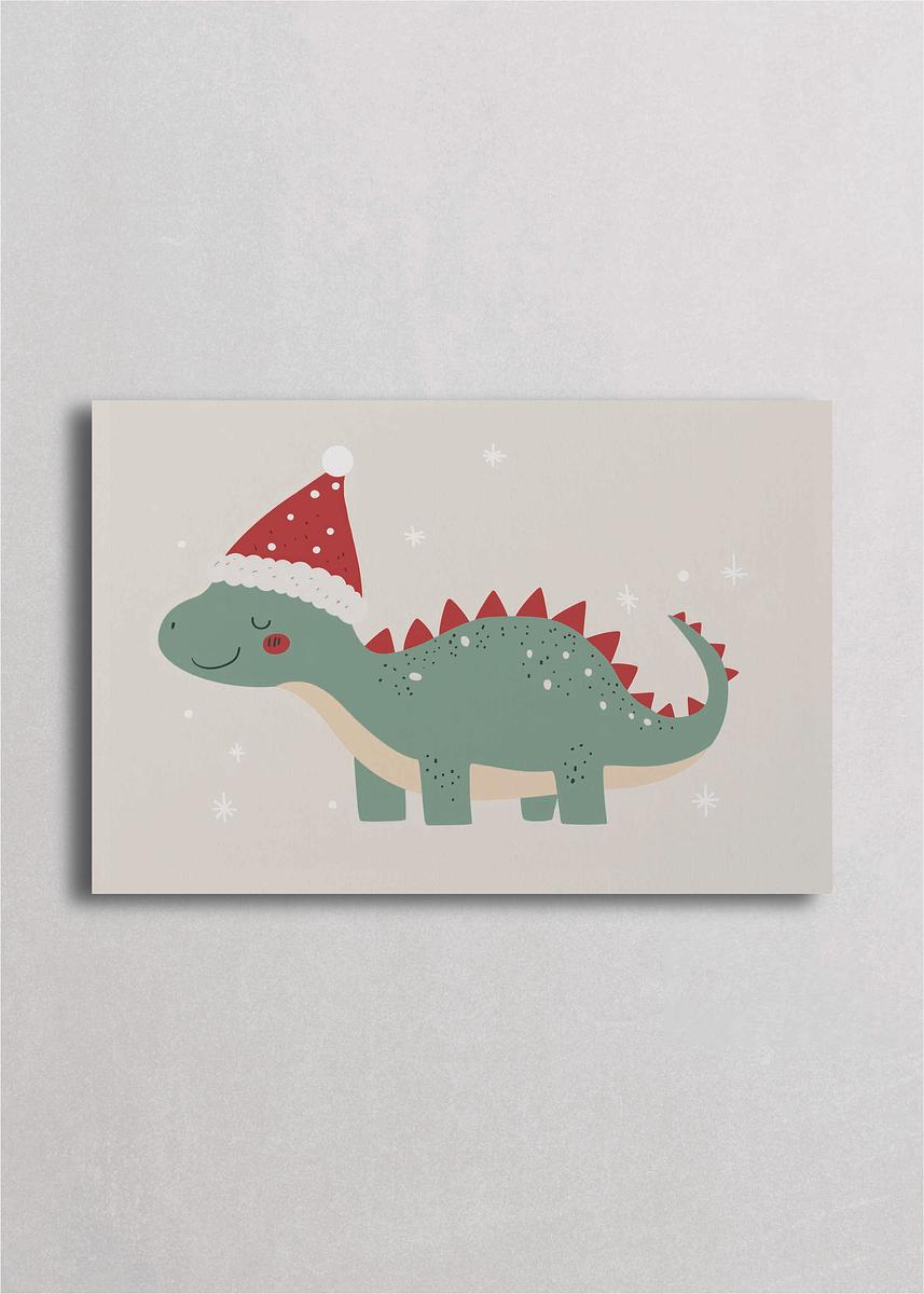 Adorable dinosaurio estegosaurio verde salvia con placas dorsales rojas y crema luciendo un gorro navideño rojo con lunares blancos y pompón esponjoso, bajo suaves copos de nieve sobre fondo crema neutro. Esta ilustración horizontal minimalista combina la fascinación infantil por los dinosaurios con el espíritu festivo navideño, creando una pieza caprichosa y original perfecta para habitaciones de niños que aman los dinosaurios y las fiestas. Con estilo escandinavo contemporáneo, paleta suave de colores pastel y expresión dulce con mejillas rosadas, transmite diversión, imaginación desbordante y la magia de mezclar mundos prehistóricos con tradiciones navideñas modernas de forma absolutamente encantadora y juguetona.