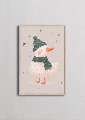 Pato blanco elegante con perfil lateral usando gorro tejido verde oliva con pompón y bufanda a juego bajo estrellas invernales delicadas. Esta ilustración vertical minimalista con fondo crema captura la sofisticación simple de las aves de granja vestidas para el invierno, transmitiendo calidez rural, encanto campestre y estilo escandinavo contemporáneo sofisticado.