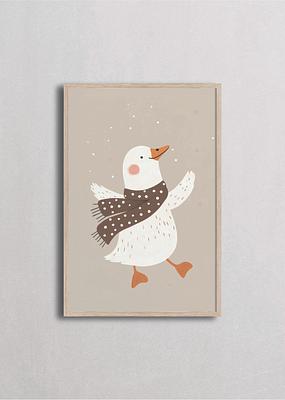 Pato blanco alegre danzando con las alas extendidas, luciendo una bufanda marrón chocolate con lunares blancos sobre fondo crema suave. Esta ilustración juguetona y minimalista captura el espíritu libre y la felicidad pura del invierno con un toque humorístico adorable, perfecta para agregar personalidad única y sonrisas a cualquier espacio navideño contemporáneo.