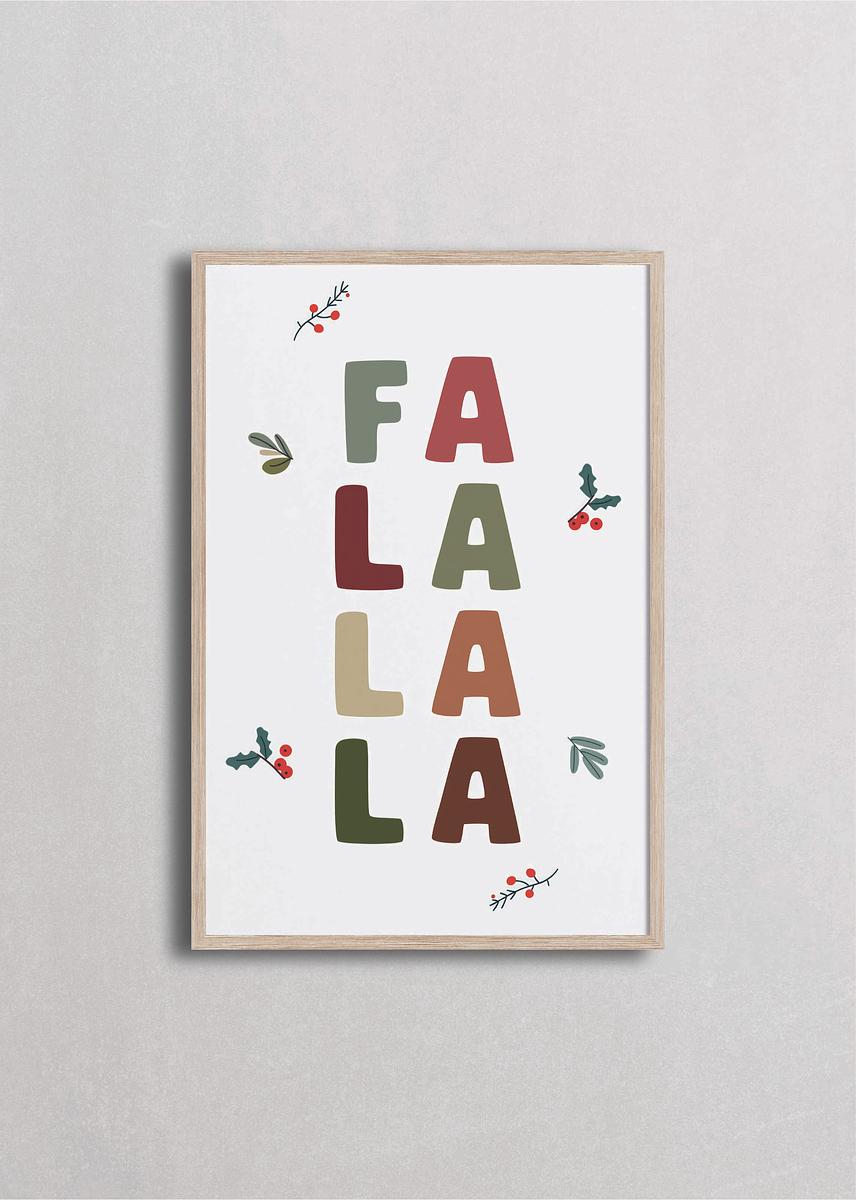 Cascada vertical de "FA LA LA LA" en letras alternadas de verde sage, terracota y mostaza con elementos botanicals dispersos sobre fondo blanco. Esta composición rítmica y musical presenta las sílabas del clásico villancico en formato vertical descendente, acompañadas de holly y ramitas. Los tonos tierra naturales y el diseño tipo canción la hacen perfecta para espacios que aman los villancicos tradicionales, la música navideña, la alegría expresada en canciones y ese espíritu festivo que se canta en coros familiares llenos de armonía, tradición y felicidad compartida.