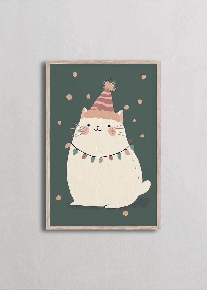 Encantador gato blanco con gorro de fiesta a rayas y collar de luces navideñas sobre elegante fondo verde oscuro. La combinación de tonos neutros con acentos festivos crea una atmósfera sofisticada pero juguetona. Ideal para amantes de los gatos que buscan decoración navideña minimalista con personalidad y estilo contemporáneo.