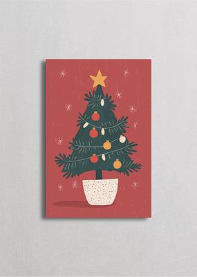 Árbol de Navidad en maceta decorado con esferas rojas, doradas y crema sobre fondo coral intenso. Estrella dorada en la punta y destellos brillantes alrededor crean una atmósfera festiva y alegre. Diseño vibrante perfecto para decoración navideña moderna y colorida.
