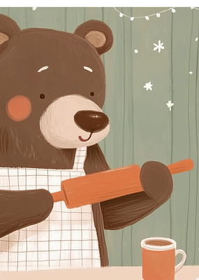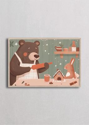 Escena acogedora de un oso y un conejo decorando una casa de jengibre juntos en una cocina navideña. Los tonos tierra cálidos, el delantal a cuadros y los detalles como las especias y la taza humeante crean una atmósfera hogareña perfecta. Ideal para cocinas, comedores o cualquier espacio donde se celebre la tradición de hornear en familia durante las fiestas.