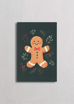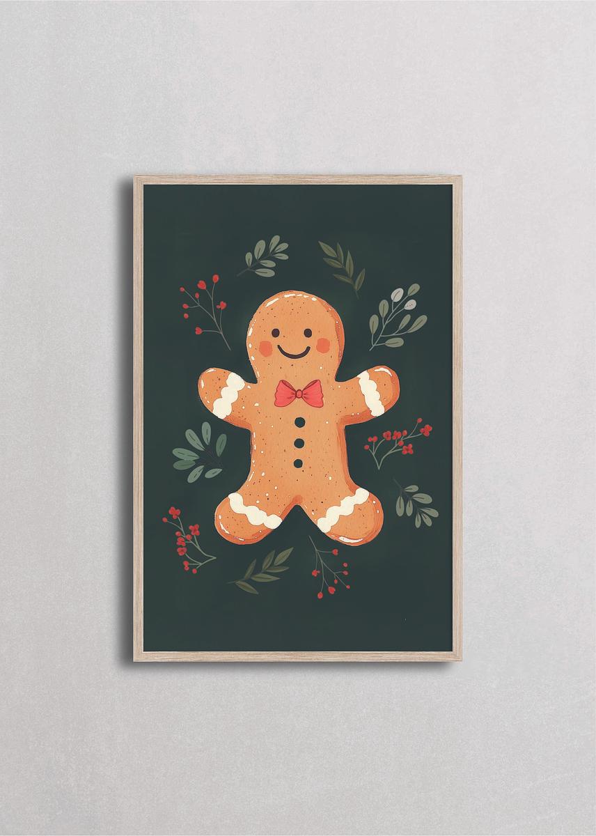 Galleta de jengibre sonriente con moño rojo, rodeada de vegetación festiva y bayas sobre fondo verde profundo. Esta ilustración juguetona y cálida celebra las tradiciones culinarias navideñas con un estilo folk moderno. Los detalles artesanales y la expresión amigable del gingerbread aportan dulzura y nostalgia, ideal para cocinas y comedores que buscan un toque festivo acogedor y familiar.