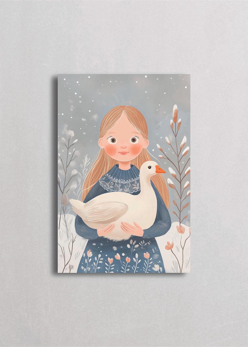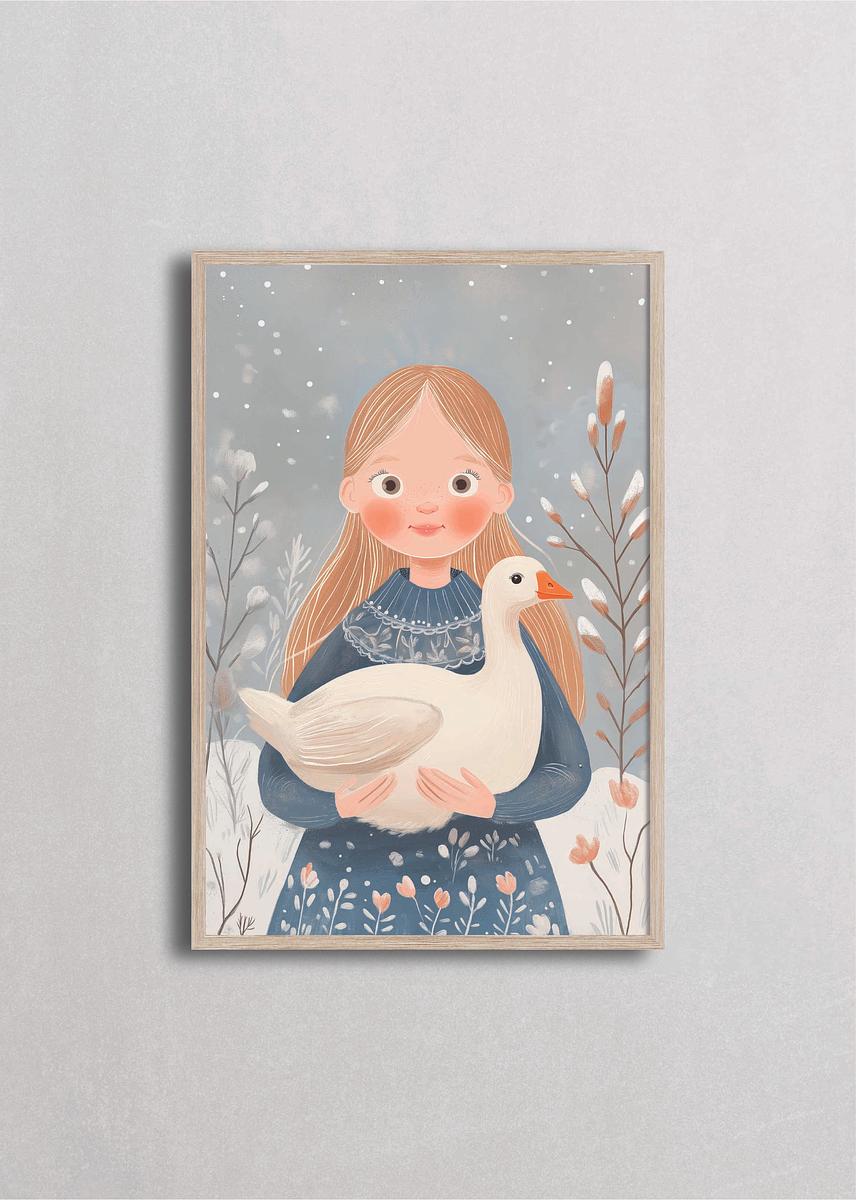 Niña dulce de cabello rubio abrazando un ganso blanco en paisaje invernal nevado. Esta ilustración tierna evoca cuentos clásicos escandinavos y la conexión especial entre niños y animales durante el invierno. Los tonos suaves en azul pizarra, melocotón y crema con detalles florales crean una atmósfera de cuento de hadas, perfecta para habitaciones infantiles que buscan ternura, calidez emocional y ese toque de magia nórdica atemporal.