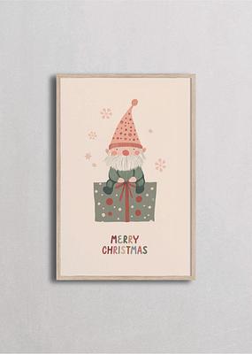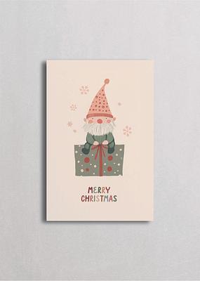 Gnomo escandinavo adorable con gorro de lunares coral emergiendo de caja de regalo verde con mensaje "Merry Christmas". Esta postal encantadora celebra la sorpresa y la alegría de recibir regalos inesperados, con un gnomo barbudo y sonriente asomándose con brazos extendidos. Los tonos coral, verde sage y crema con patrones de lunares y texturas dibujadas a mano la hacen ideal para quienes aman el folklore nórdico, las tradiciones hygge y esos momentos mágicos de sorpresas navideñas llenas de ternura.