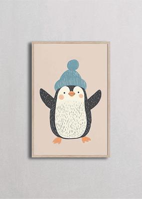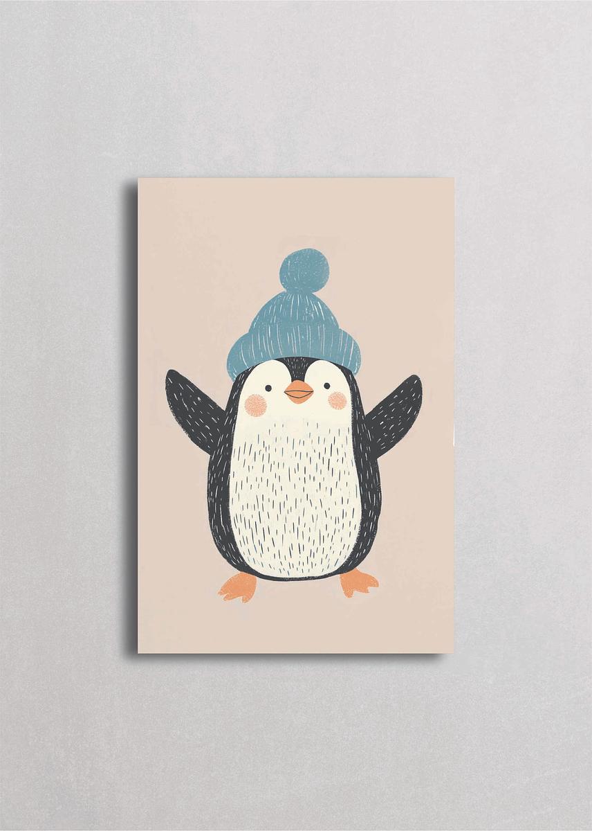 Pingüino juguetón con las alitas extendidas en gesto alegre, luciendo un gorro tejido azul con pompón sobre fondo crema neutro. Esta ilustración minimalista con textura de trazos delicados captura la pura felicidad y el entusiasmo infantil del invierno con un estilo simple, limpio y absolutamente encantador que derrite corazones.