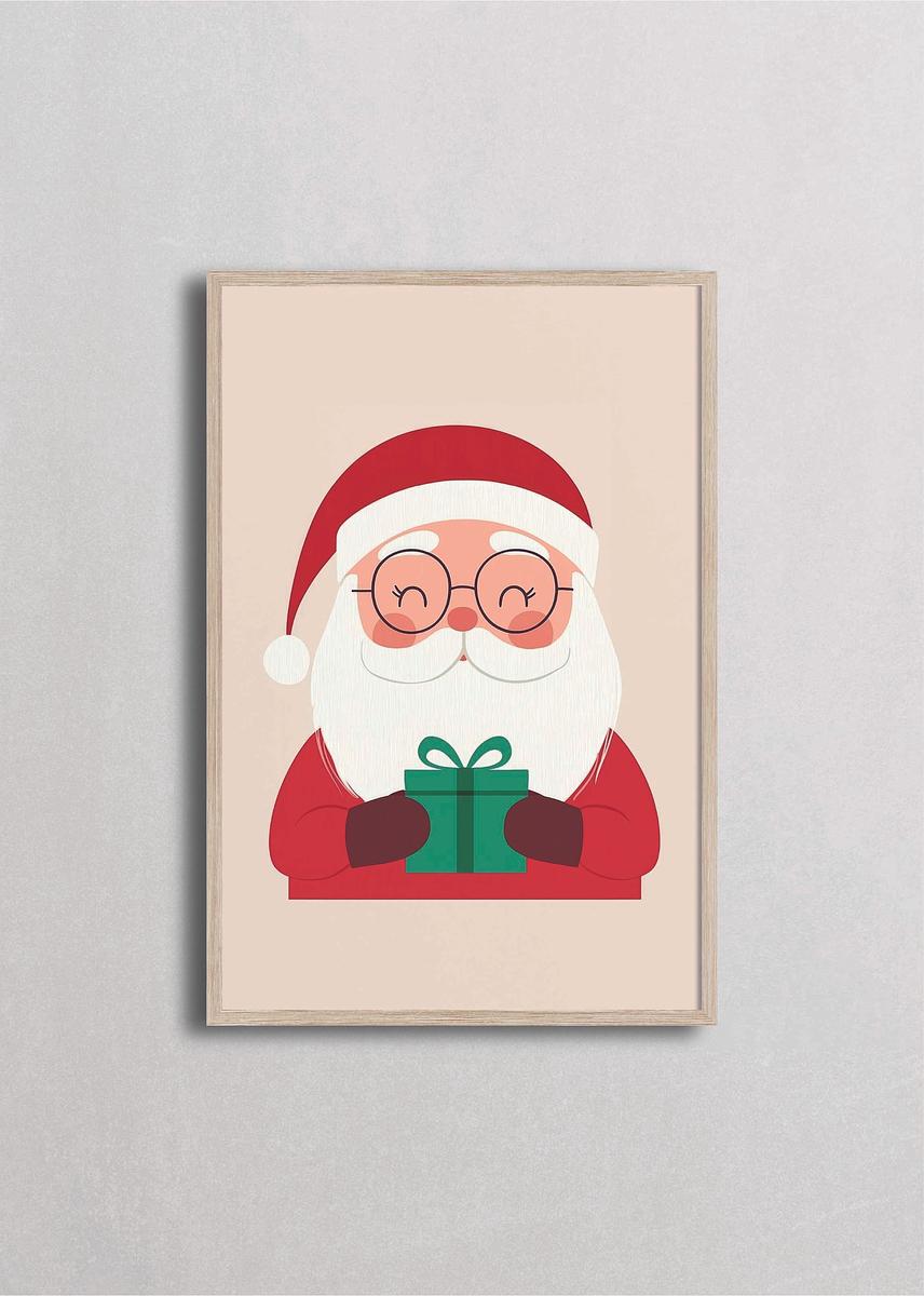Santa minimalista con lentes y sonrisa radiante sosteniendo regalo verde sobre fondo crema ultraclean. Este diseño supersimple y directo presenta a Santa en su esencia más pura con paleta tradicional de rojo brillante, verde esmeralda y crema. El estilo de ilustración plana con formas geométricas básicas y expresión adorable lo convierte en perfecto para espacios infantiles, diseños contemporáneos que valoran la síntesis visual, la claridad del mensaje y una Navidad alegre, directa y llena de optimismo contagioso sin complicaciones.