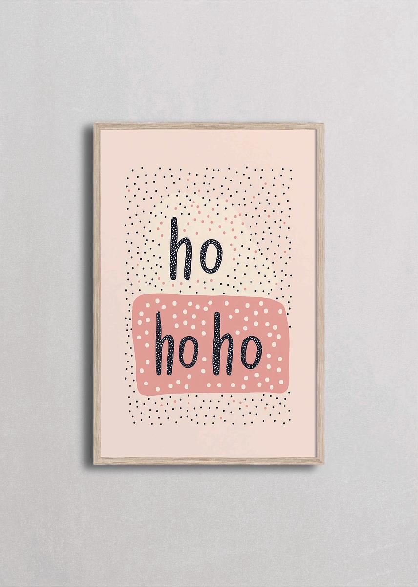 Composición moderna con "ho ho ho" en tipografía negra sobre rectángulo coral con pattern de luncos, rodeado de puntos dispersos sobre fondo blush. Esta versión contemporánea y gráfica juega con capas de texturas de puntos en negro, coral y rosa. El diseño asimétrico y playful con formas geométricas y patterns repetitivos la hace ideal para espacios modernos que aman el diseño gráfico atrevido, la alegría expresada con simplicidad y una Navidad visualmente innovadora que rompe con lo tradicional sin perder el espíritu festivo esencial.
