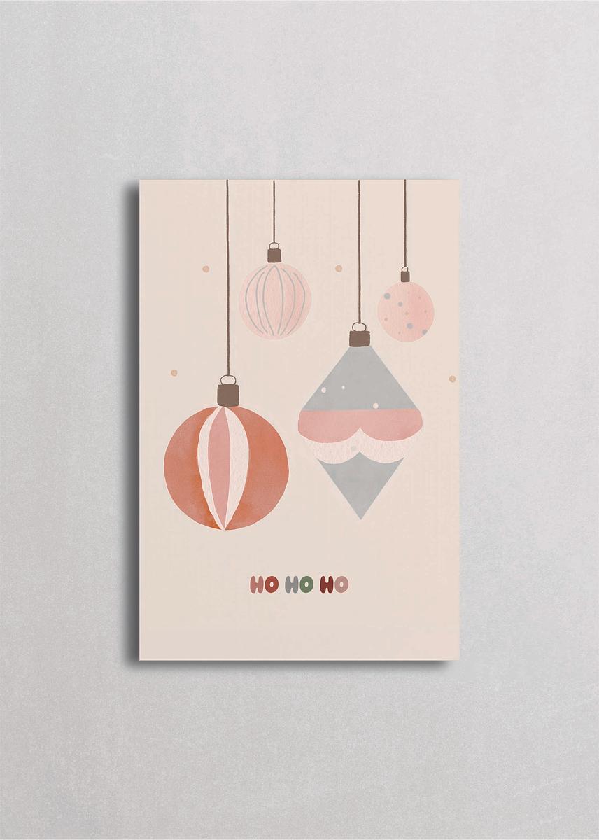 Elegante composición de esferas navideñas colgantes en tonos terracota, rosa suave y gris perla con detalles decorativos únicos. El mensaje "Ho Ho Ho" añade un toque festivo y alegre. Colores neutros perfectos para espacios modernos que buscan decoración navideña sofisticada pero acogedora.