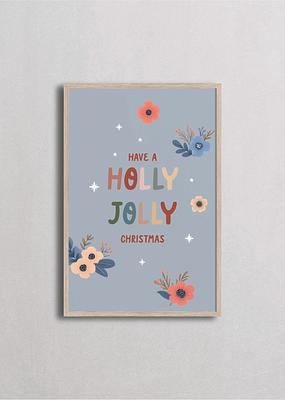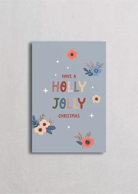 Composición floral vintage con mensaje "Have a Holly Jolly Christmas" rodeado de flores estilizadas en coral, azul y crema sobre fondo gris azulado suave. Esta pieza combina tipografía alegre con botanicals pintados a mano que crean un marco orgánico y natural. Los tonos apagados en sage, coral y mostaza con flores de cinco pétalos le dan un aire cottage moderno, perfecta para quienes aman una Navidad con toque botanical, feminidad suave y ese espíritu festivo que celebra tanto la tradición como la naturaleza invernal.