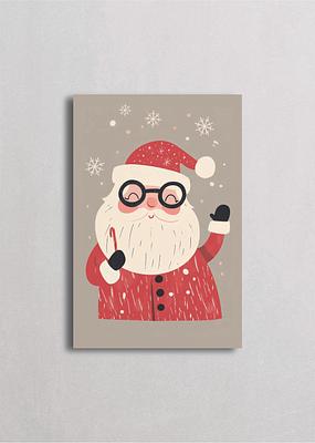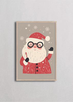 Santa Claus vintage con lentes redondos saludando alegremente bajo copos de nieve sobre fondo beige neutro. Este retrato cercano y cálido muestra a Santa en su versión más amigable y accesible, con mejillas rosadas y expresión jovial. El estilo ilustrativo retro con texturas dibujadas a mano y la paleta de rojo brillante, blanco y negro lo convierten en perfecto para espacios que buscan una Navidad nostálgica, acogedora y llena de ese espíritu genuino que nos hace creer en la magia.