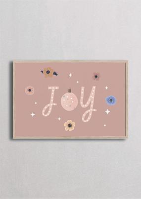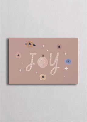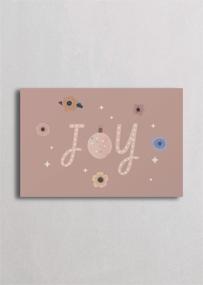 Palabra "Joy" en letras decoradas con lunares rodeada de flores botanicals y esfera navideña sobre fondo dusty rose cálido. Esta composición horizontal combina tipografía festiva con elementos florales dispersos y una esfera ornamental integrada en la letra O. Los tonos terra cotta, azul pálido, mostaza y coral sobre fondo rosado empolvado crean una atmósfera acogedora y femenina, perfecta para espacios que celebran la alegría como centro de la Navidad, con estética cottage moderna, dulzura sin ser empalagosa y ese optimismo genuino.