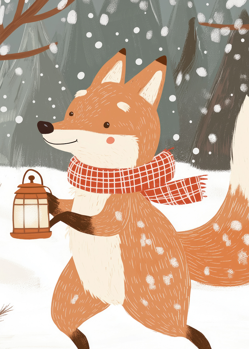 Zorro juguetón danzando en un bosque nevado con una linterna en la mano, luciendo una bufanda de cuadros rojos. Los árboles cubiertos de nieve y la atmósfera gris crean una escena mágica que captura el espíritu alegre y aventurero del invierno con un toque vintage encantador.