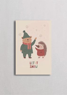 Dulce ilustración de un oso y un erizo amigos celebrando la llegada de la nieve con ropa invernal coordinada en tonos verde y terracota. Su alegría compartida y los copos de nieve cayendo transmiten la magia del invierno. Perfecto para espacios infantiles o cualquier rincón que necesite un recordatorio de la belleza simple de las primeras nevadas.