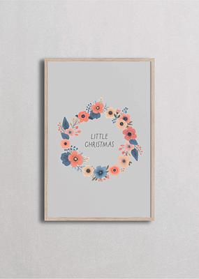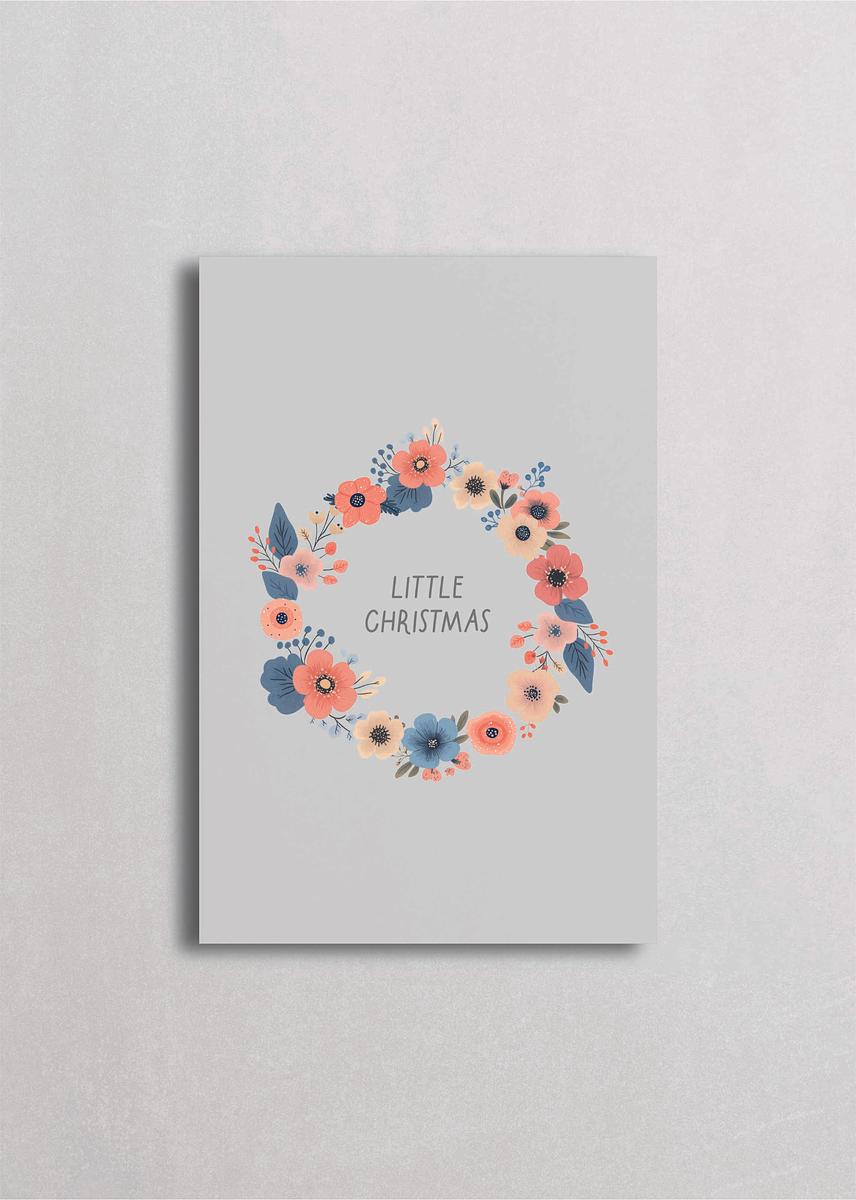 Corona ovalada de flores invernales en tonos coral, azul slate y melocotón con mensaje "Little Christmas" al centro sobre fondo gris perla. Esta composición delicada presenta flores estilizadas tipo anémona y elementos botanicals formando un marco orgánico perfecto. La paleta suave y neutra con detalles en azul pizarra la hace ideal para espacios que buscan elegancia discreta, celebraciones íntimas y una Navidad pequeña pero significativa, recordándonos que los momentos más especiales vienen en paquetes sencillos llenos de amor auténtico.