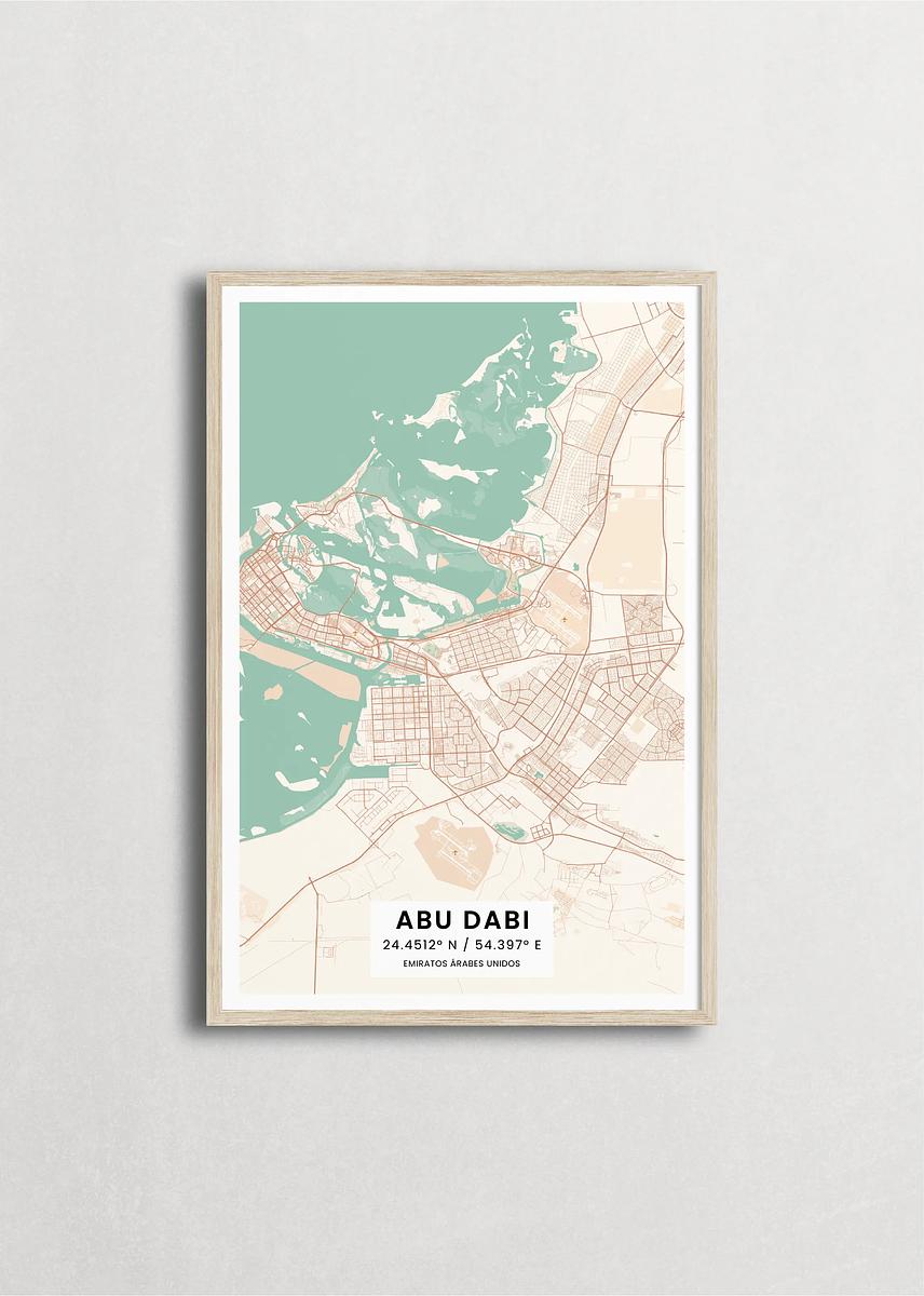 Mapa de la ciudad de Abu Dabi diseño minimalista que destaca la forma y la estructura de la ciudad. sus colores crean un contraste llamativo que es atemporal y sofisticado.