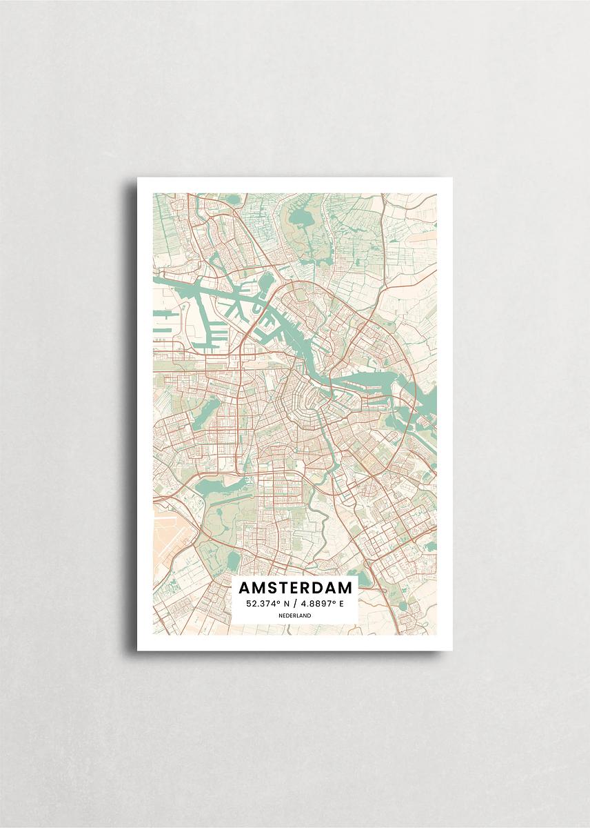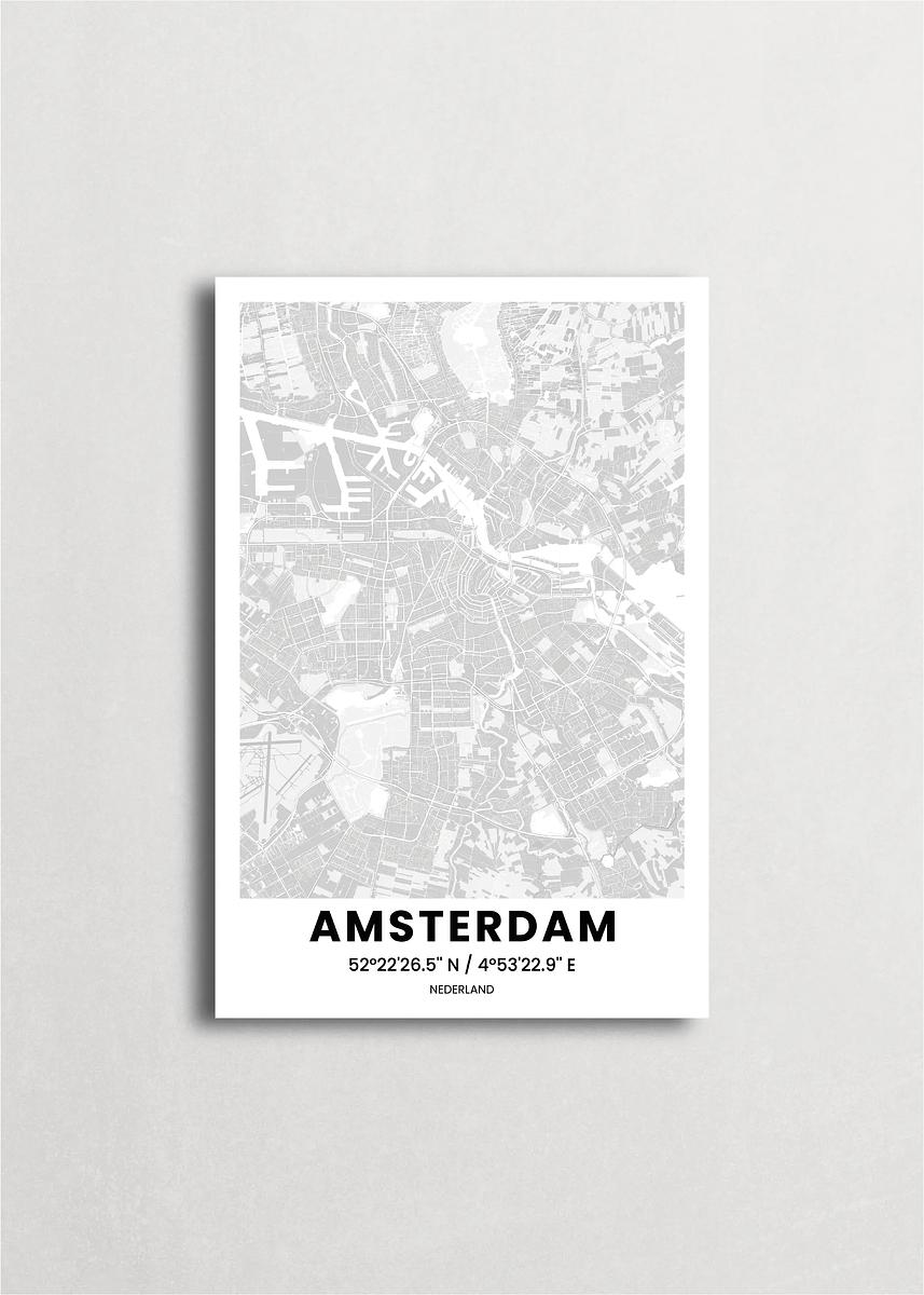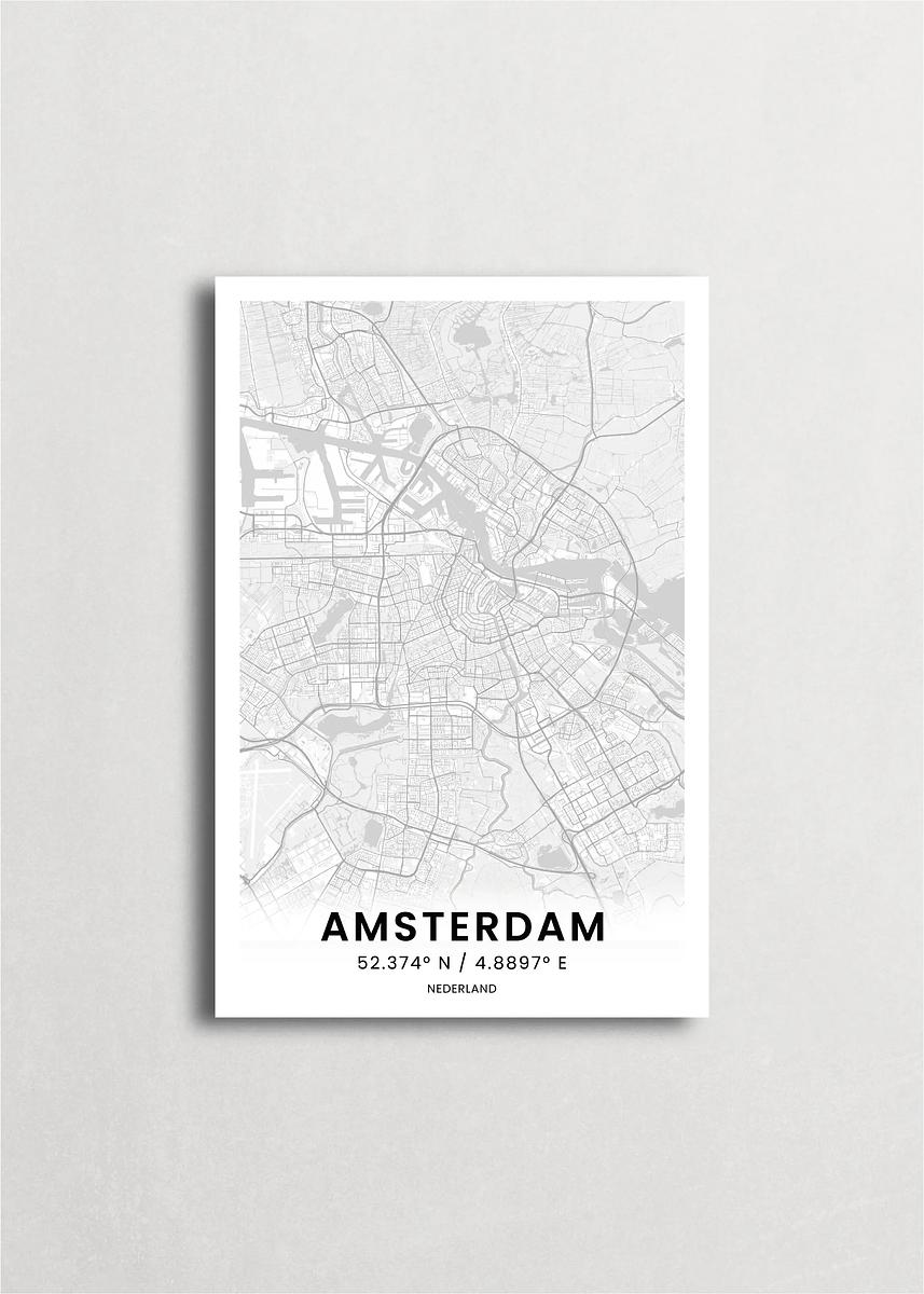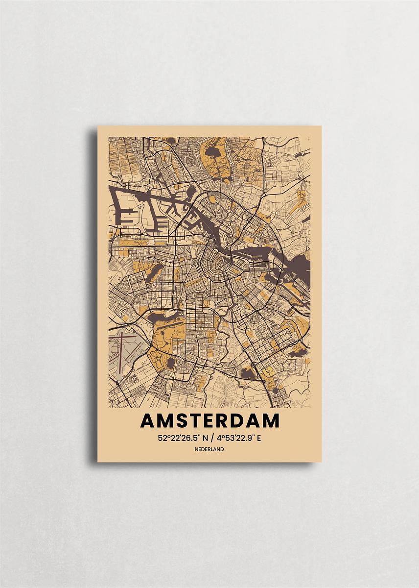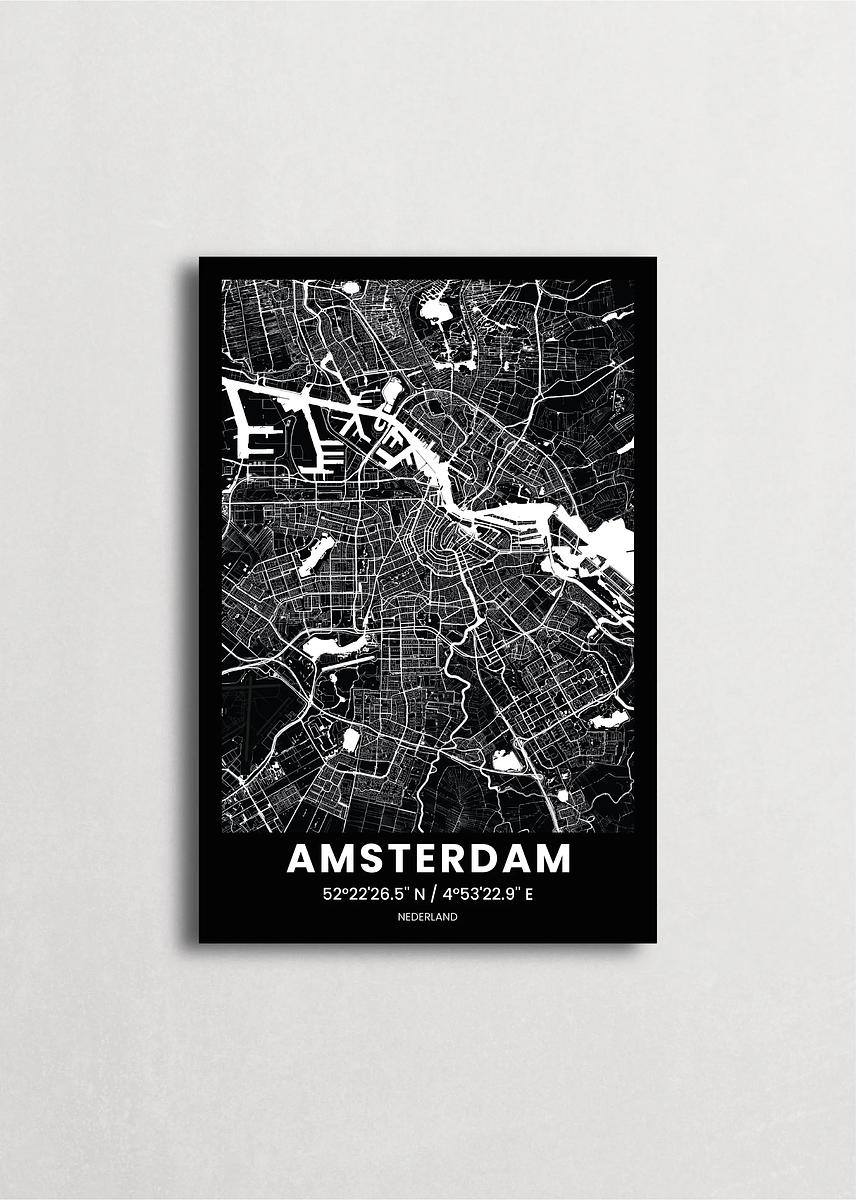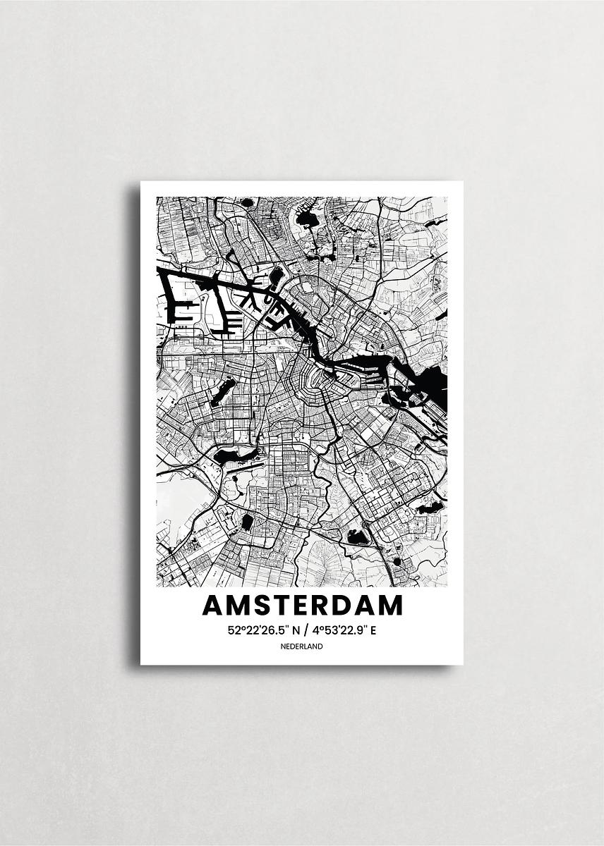 Mapa de la ciudad de Ámsterdam diseño minimalista que destaca la forma y la estructura de la ciudad. sus colores crean un contraste llamativo que es atemporal y sofisticado.