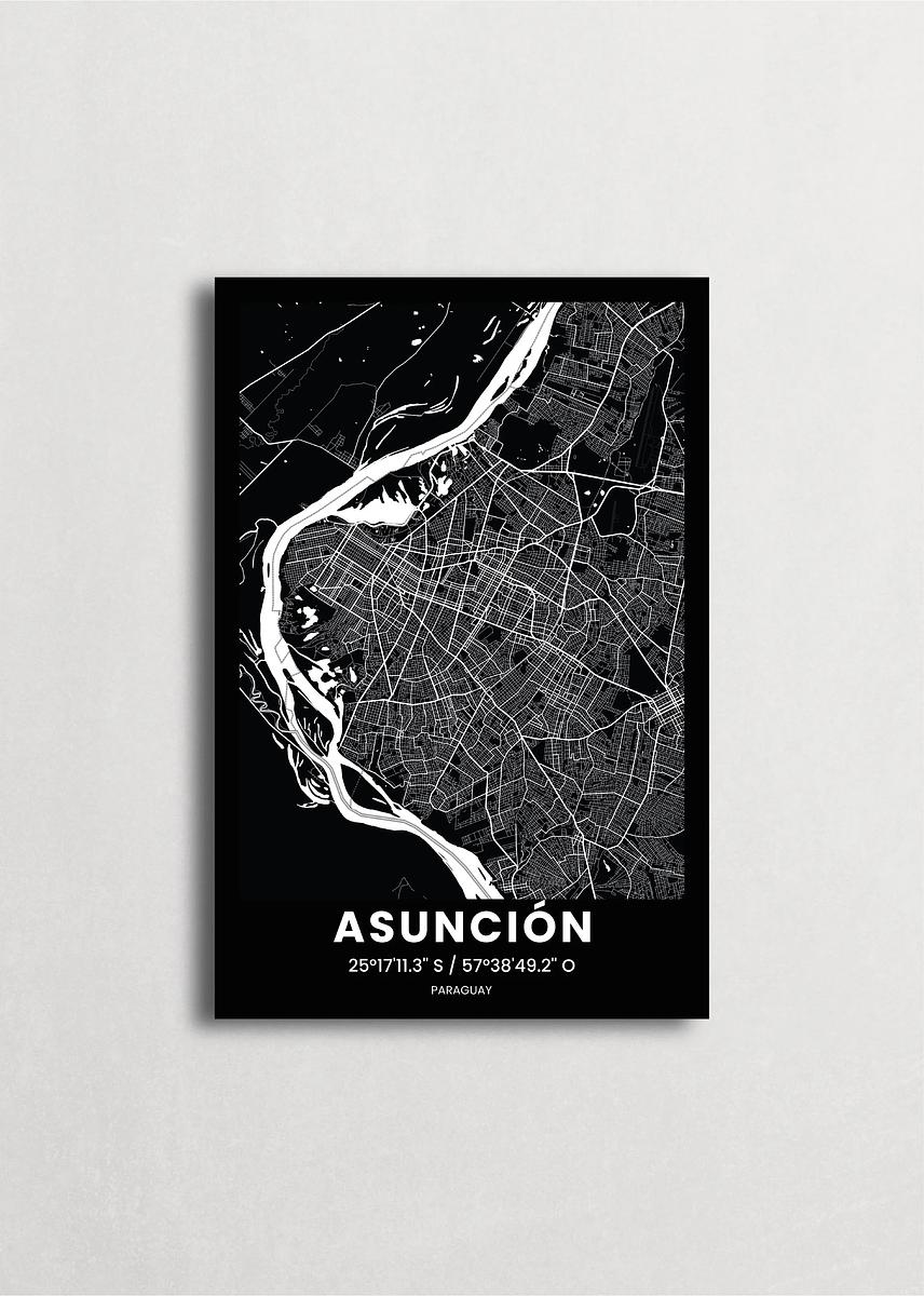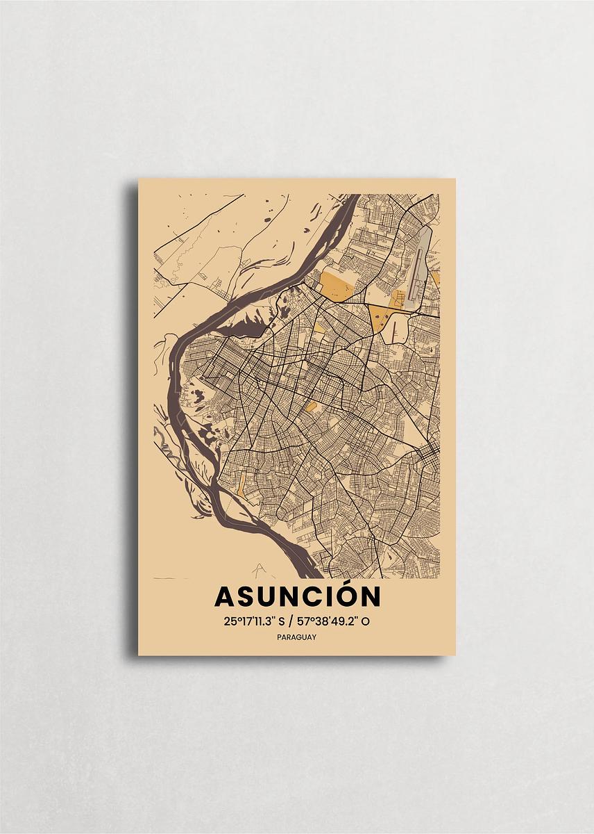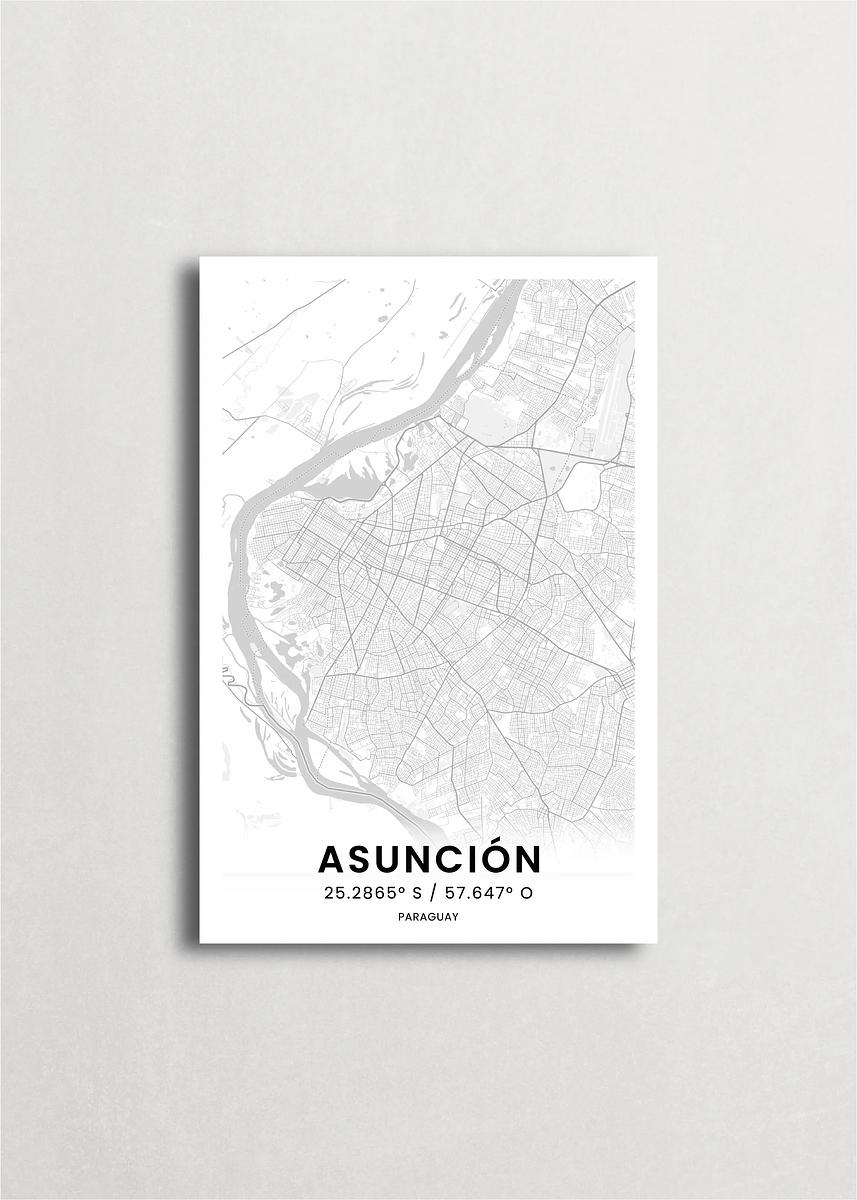 Mapa de la ciudad de Asunción diseño minimalista que destaca la forma y la estructura de la ciudad. sus colores crean un contraste llamativo que es atemporal y sofisticado.