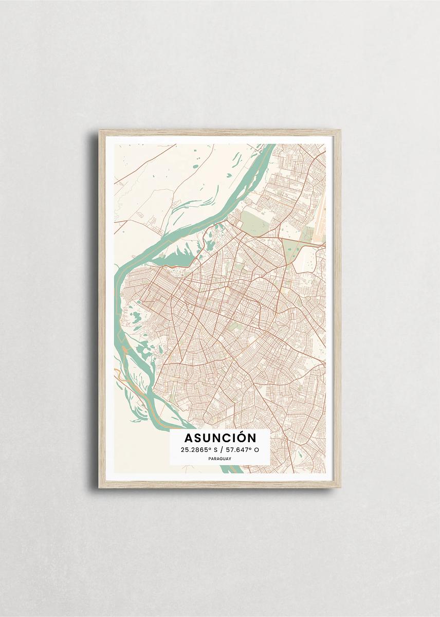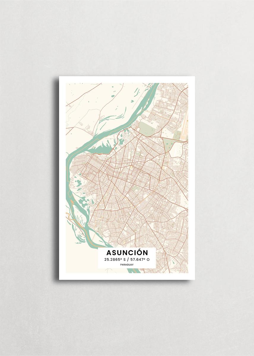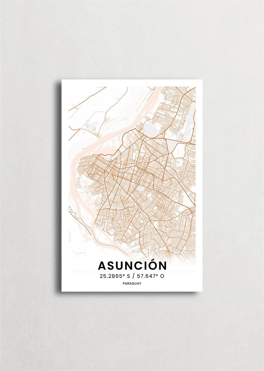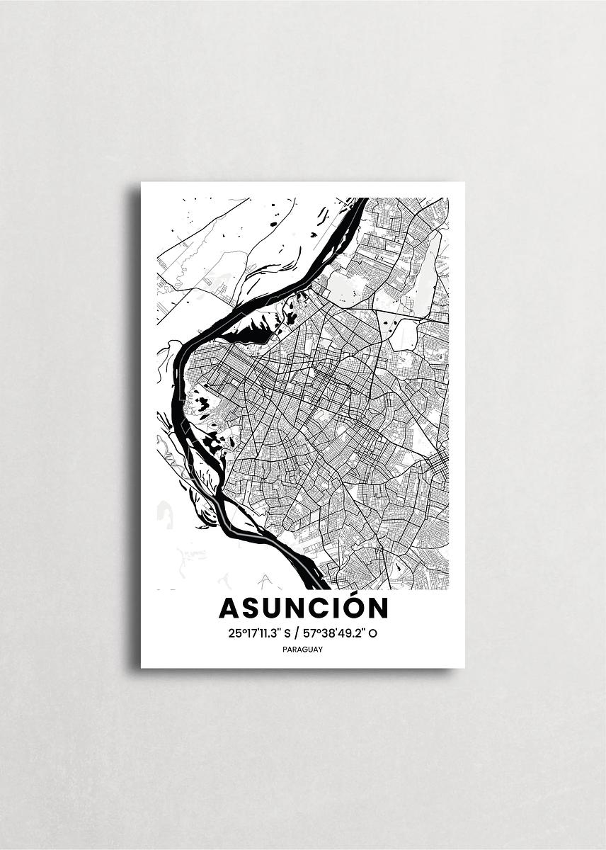 Mapa de la ciudad de Asunción diseño minimalista que destaca la forma y la estructura de la ciudad. sus colores crean un contraste llamativo que es atemporal y sofisticado.