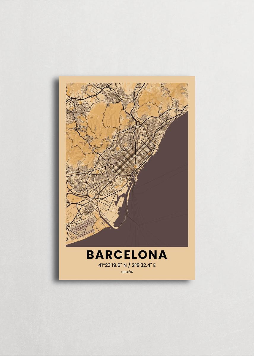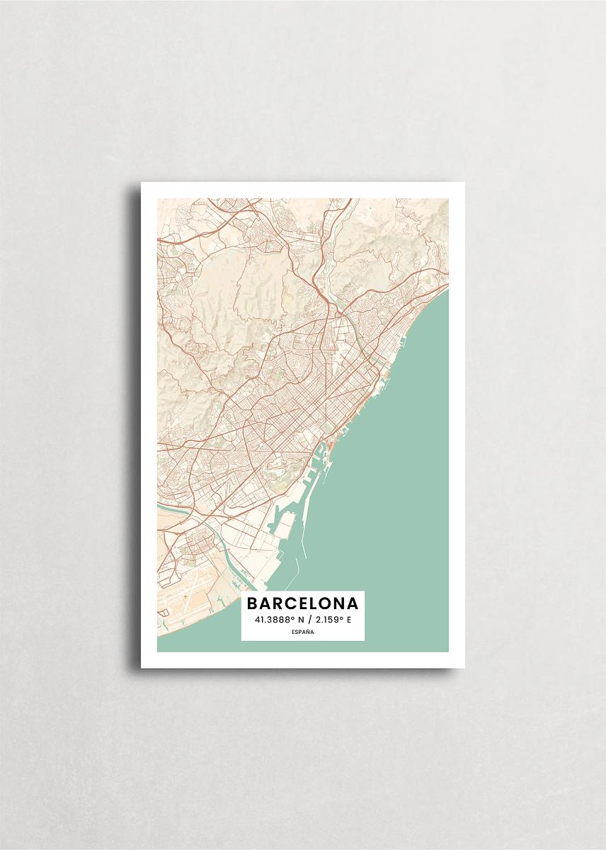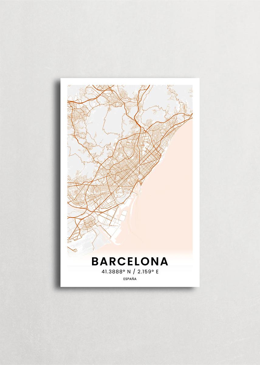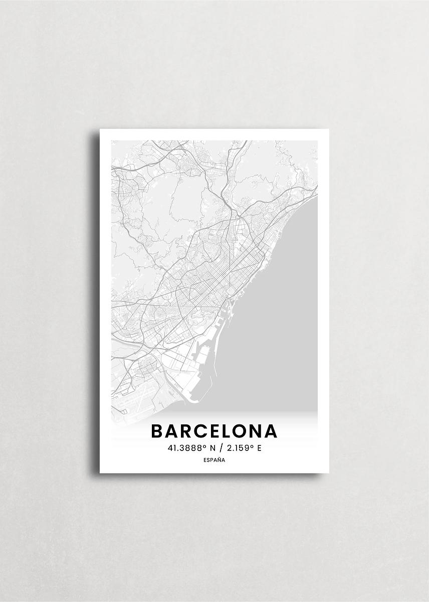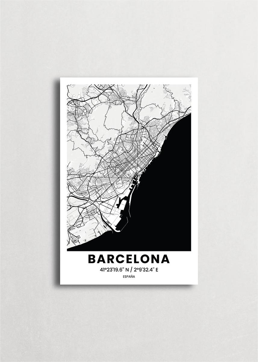Mapa de la ciudad de Barcelona diseño minimalista que destaca la forma y la estructura de la ciudad. sus colores crean un contraste llamativo que es atemporal y sofisticado.