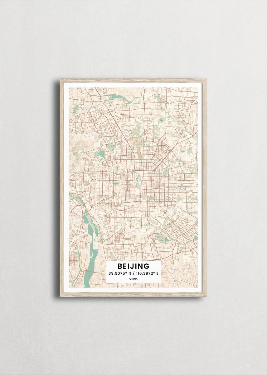 Mapa de la ciudad de Beijing diseño minimalista que destaca la forma y la estructura de la ciudad. sus colores crean un contraste llamativo que es atemporal y sofisticado.