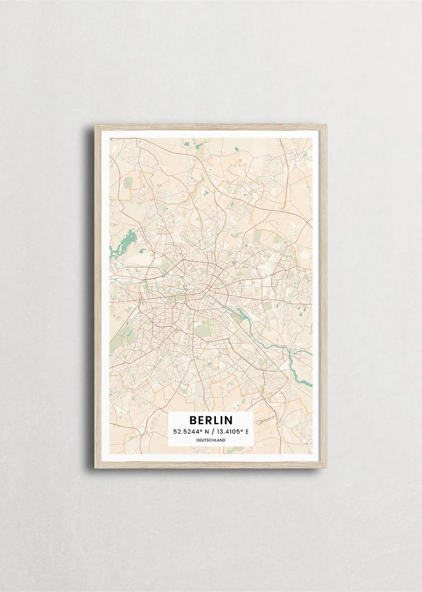 Mapa de la ciudad de Berlin diseño minimalista que destaca la forma y la estructura de la ciudad. sus colores crean un contraste llamativo que es atemporal y sofisticado.
