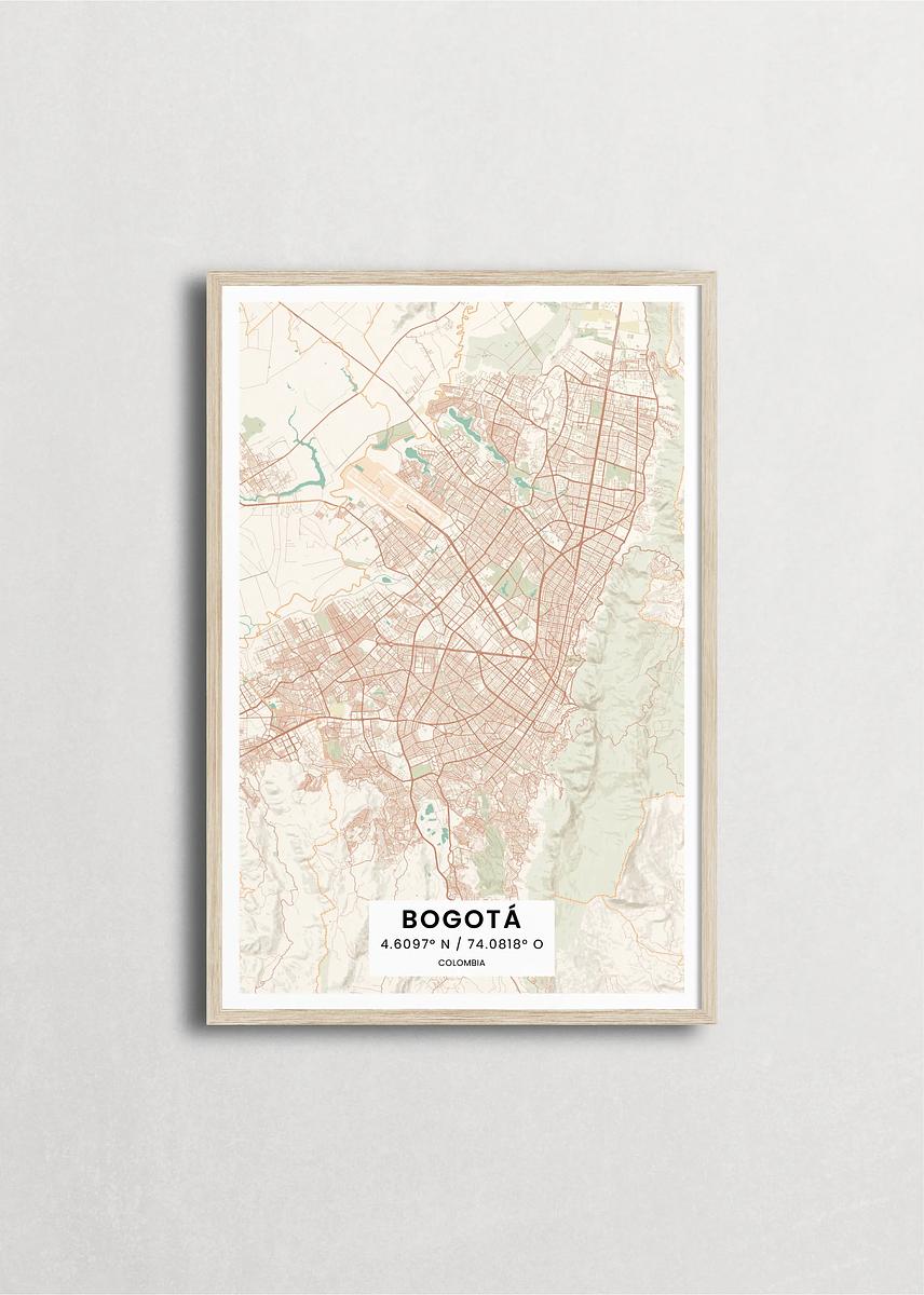 Mapa de la ciudad de Bogotá diseño minimalista que destaca la forma y la estructura de la ciudad. sus colores crean un contraste llamativo que es atemporal y sofisticado.