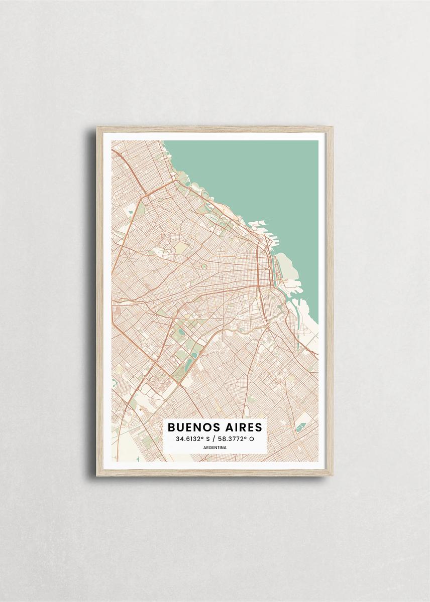 Mapa de la ciudad de Buenos Aires diseño minimalista que destaca la forma y la estructura de la ciudad. sus colores crean un contraste llamativo que es atemporal y sofisticado.