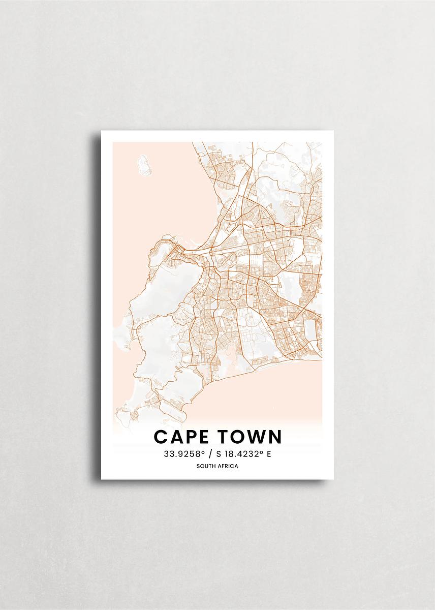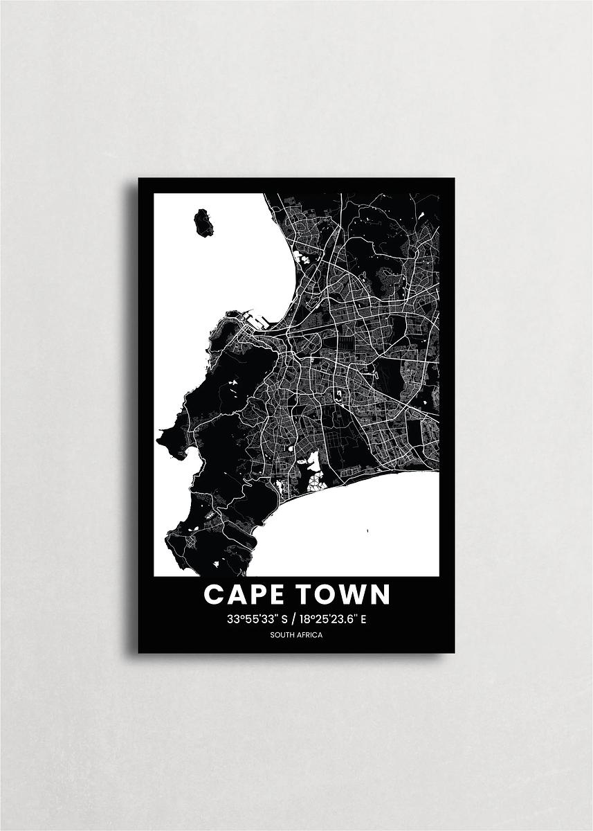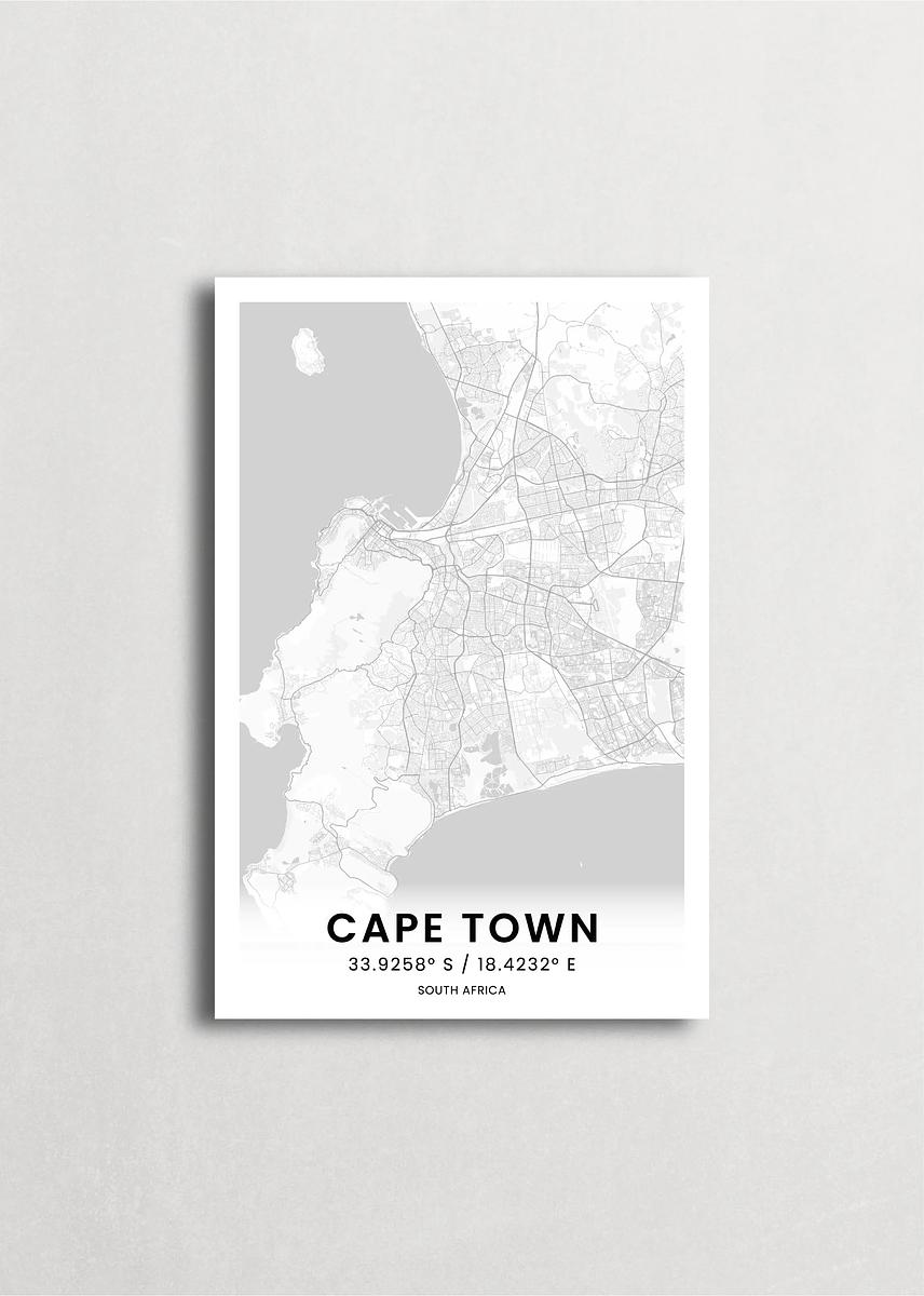 Mapa Ciudad de Cabo diseño minimalista que destaca la forma y la estructura de la ciudad. sus colores crean un contraste llamativo que es atemporal y sofisticado.