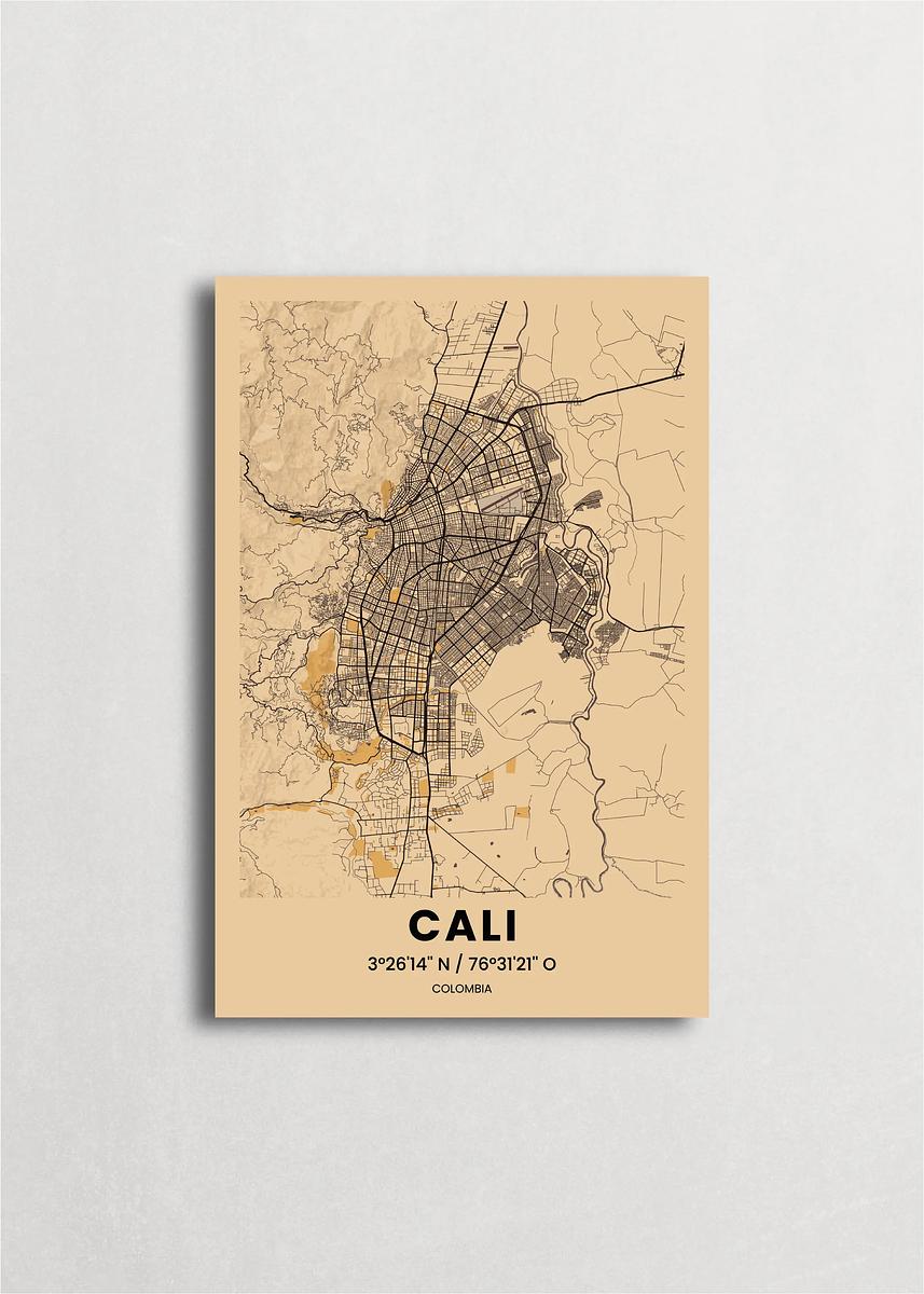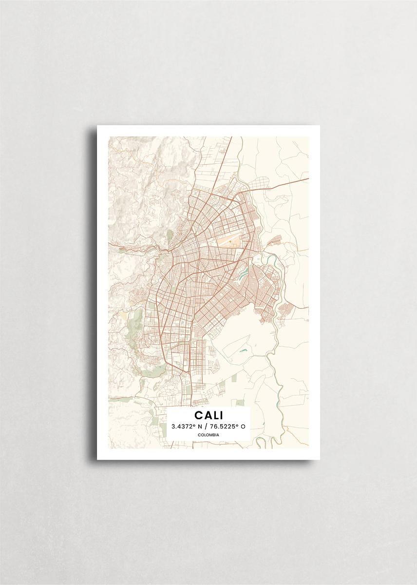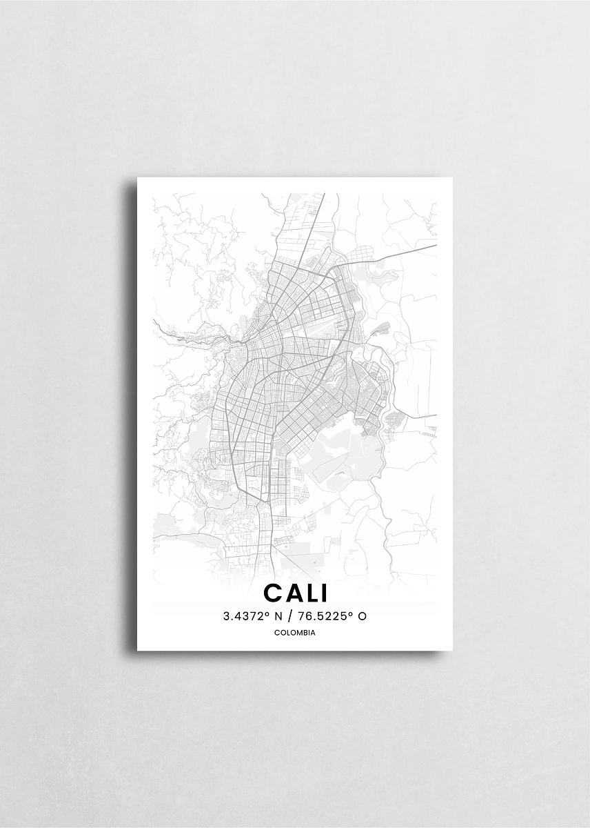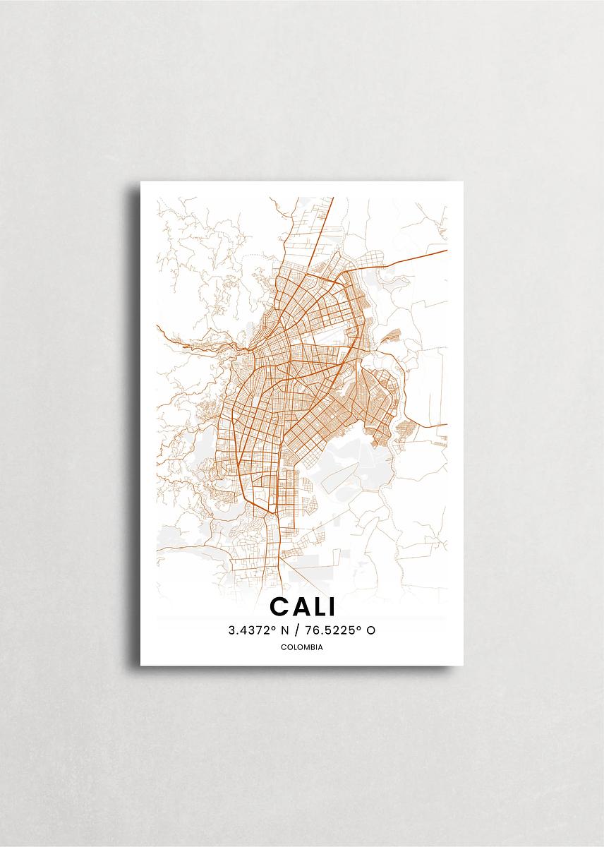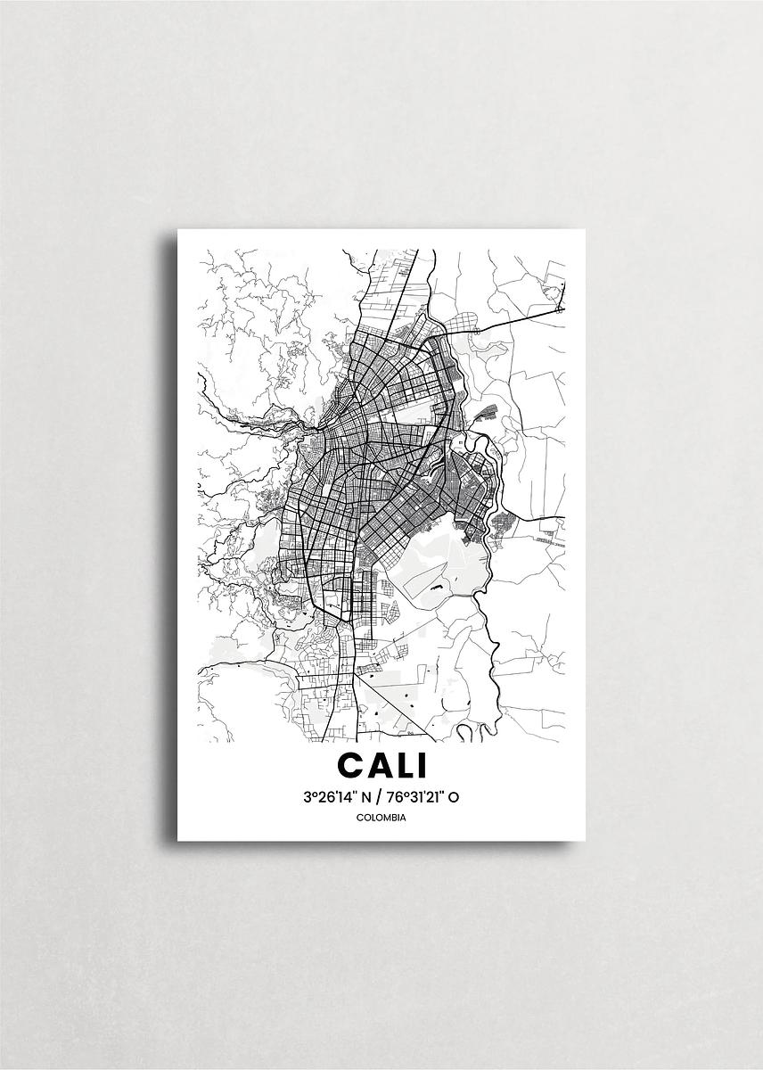 Mapa de la ciudad de Cali diseño minimalista que destaca la forma y la estructura de la ciudad. sus colores crean un contraste llamativo que es atemporal y sofisticado.