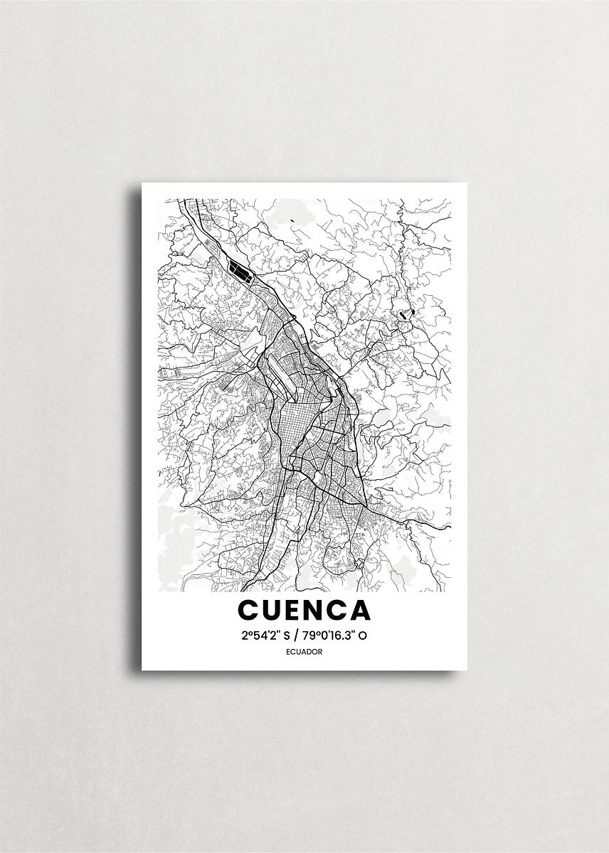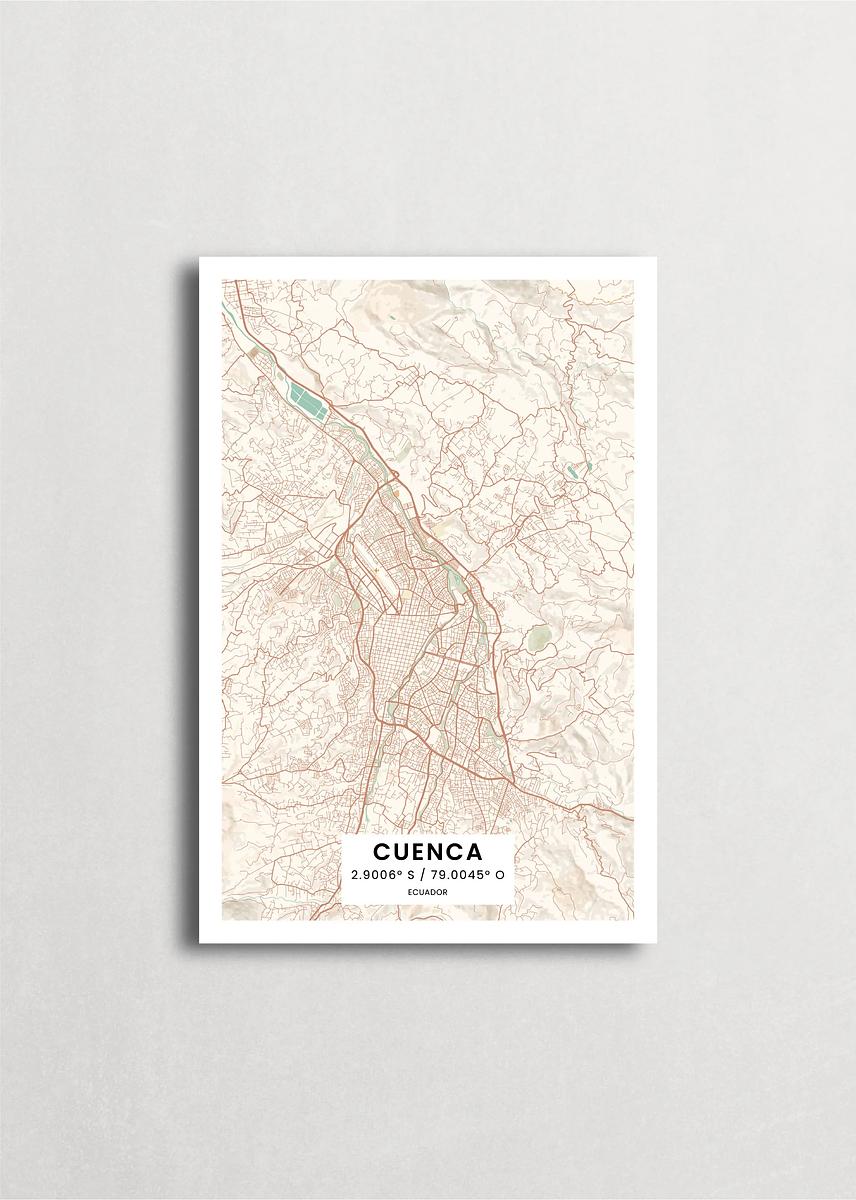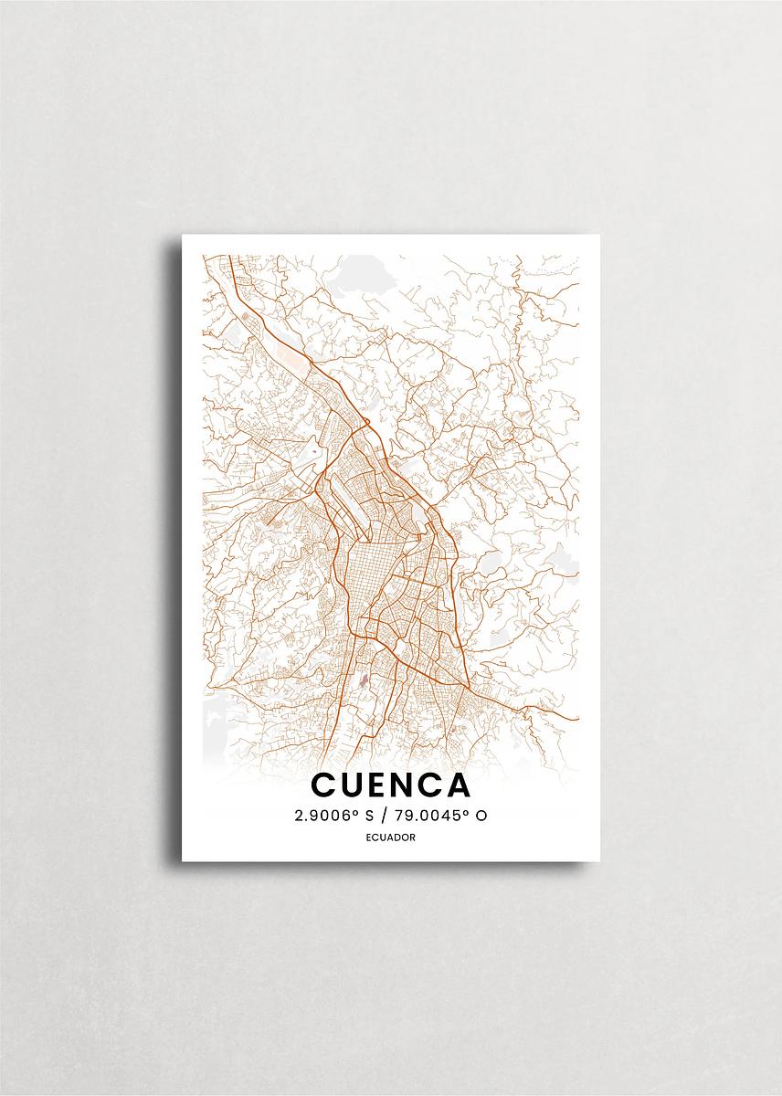 Mapa de la ciudad de Cuenca diseño minimalista que destaca la forma y la estructura de la ciudad. sus colores crean un contraste llamativo que es atemporal y sofisticado.