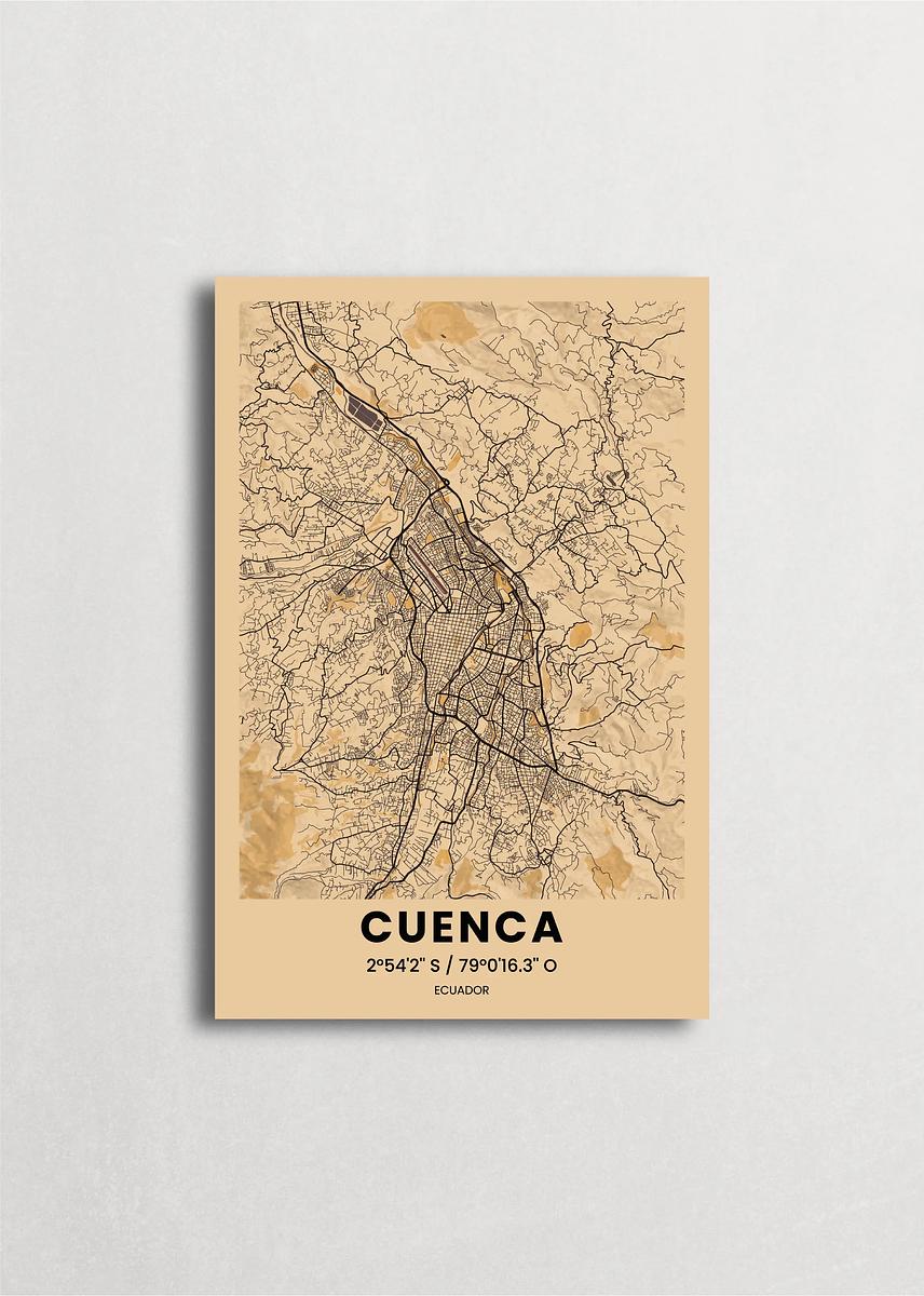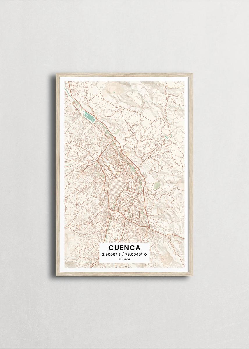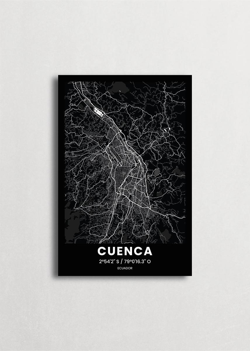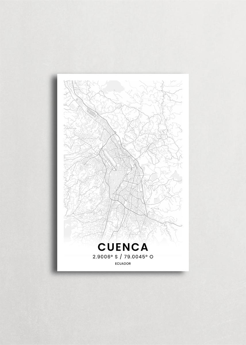 Mapa de la ciudad de Cuenca diseño minimalista que destaca la forma y la estructura de la ciudad. sus colores crean un contraste llamativo que es atemporal y sofisticado.